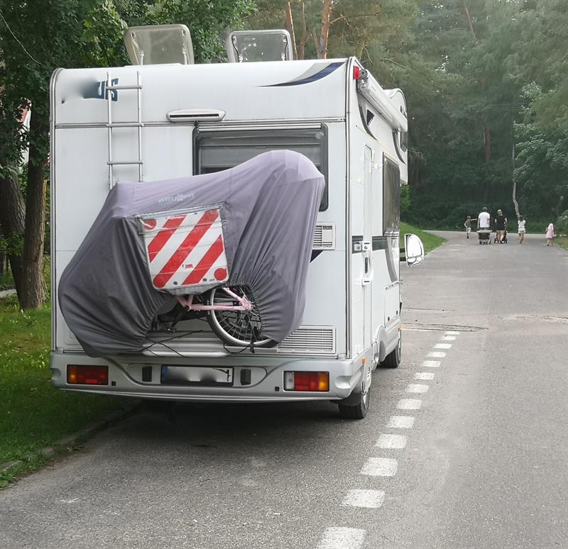 Kierowca tego niemieckiego kampera zaparkował na zakazanej dla samochodów trasie przy ścieżce rowerowej Pogorzelica - Mrzeżyno.