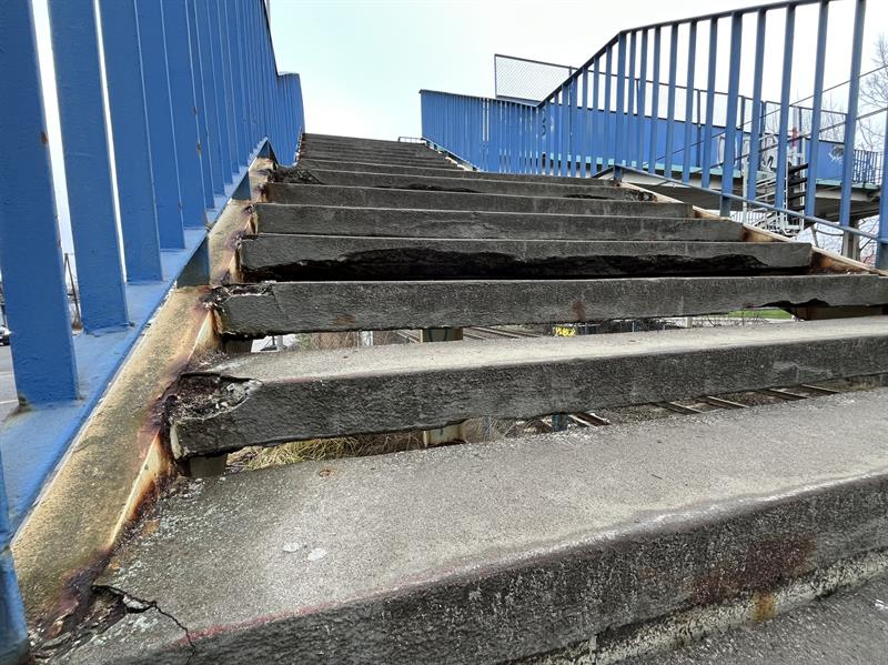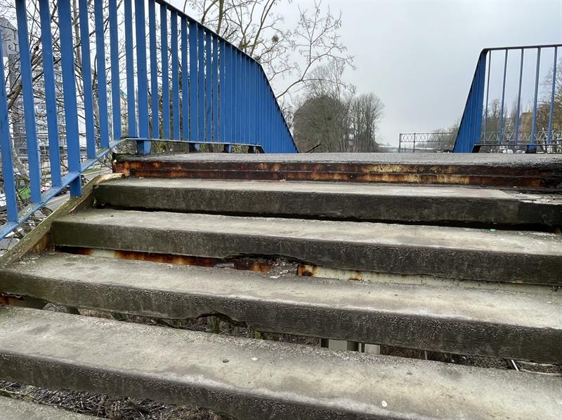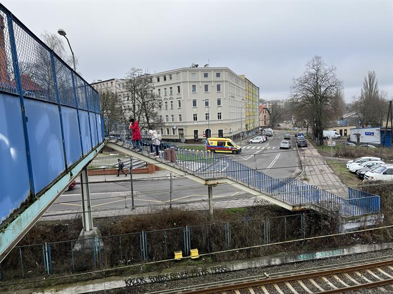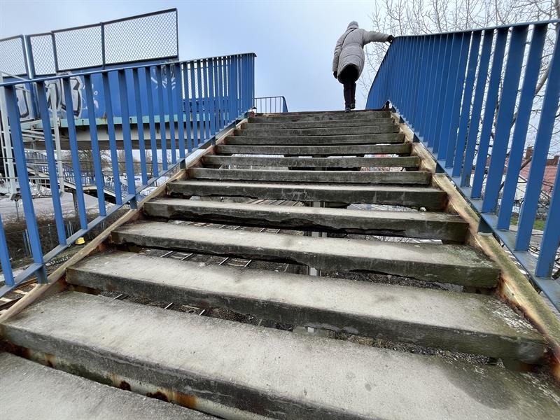 Jest w stanie budzącym grozę: z przerdzewiałej stalowej konstrukcji odpadają kolejne elementy zatopionych w betonie schodów. Mowa o kładce pieszej, wiszącej nad torowiskiem kolejowym, jaka łączy ul. Kolumba z Połabską i św. Józefa. Czyli o - dla korzystających z komunikacji tramwajowej - obecnie jedynej dostępnej drodze ku szpitalowi na szczecińskich Pomorzanach.