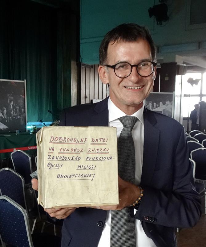 Dyrektor Centrum Solidarności „Stocznia” dr hab. Sebastian Ligarski prezentuje jedno ze znalezisk: drewnianą skarbonę, do której trafiały fundusze na założenie związków zawodowych Milicji Obywatelskiej.