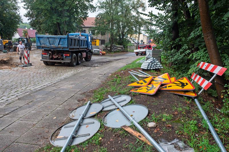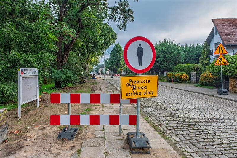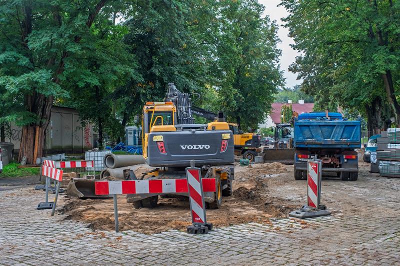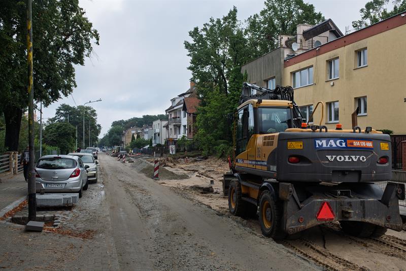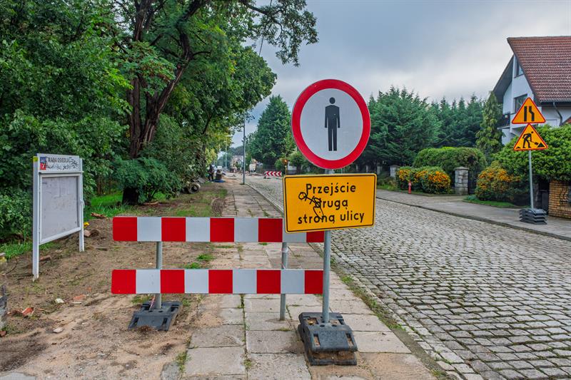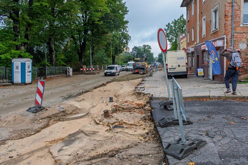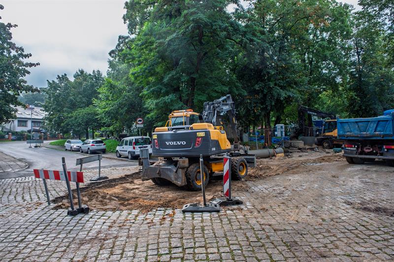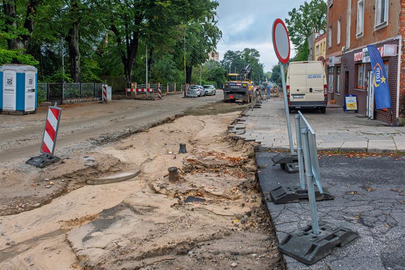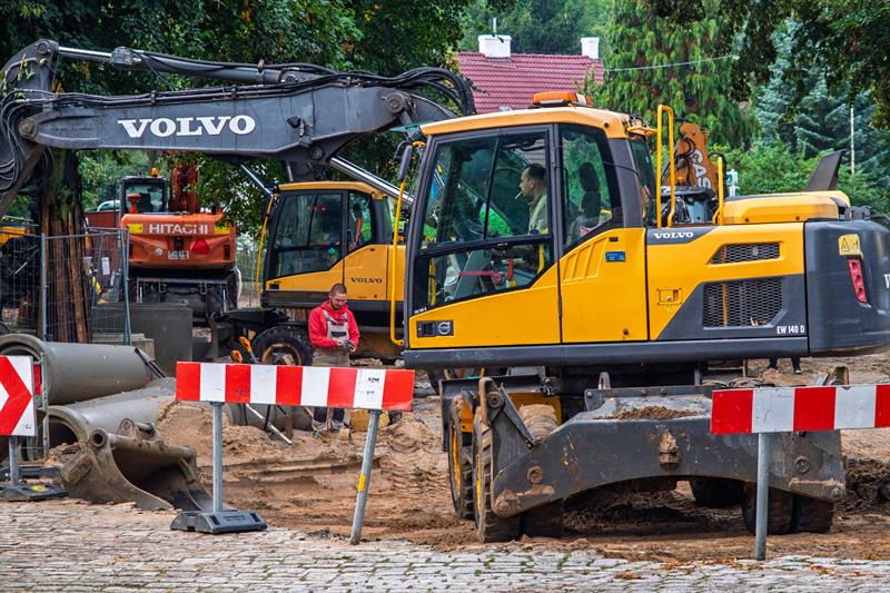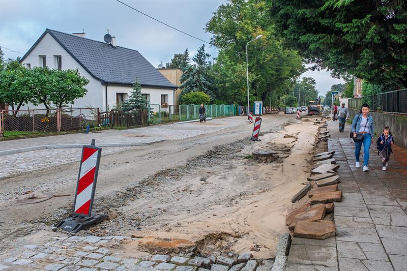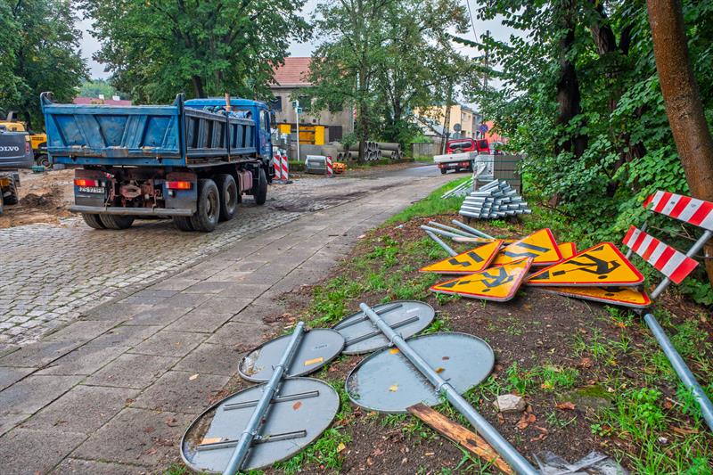 Na Krzemiennej widać już wyraźne postępy robót. Po lewej stronie ulicy, patrząc w kierunku Binowa, prowadzone są obecnie prace ziemne i brukarskie. Wcześniej podobne roboty zostały wykonane po stronie prawej, gdzie ustawiono krawężniki, obrzeża i przygotowano podbudowę pod nową jezdnię. Teraz wykonawca przesunął się na