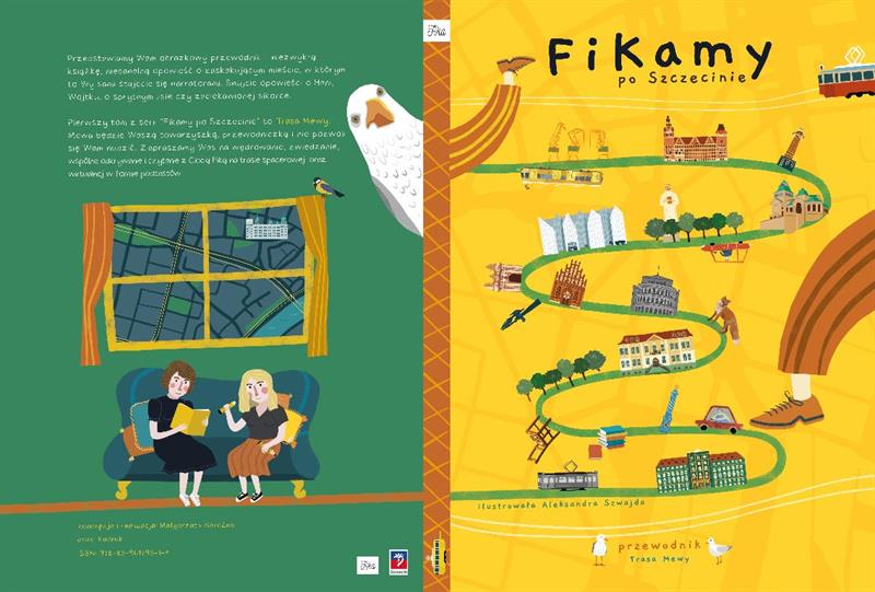 Małgosia Narożna go wymyśliła i opowiedziała, z kolei Ola Szwajda wzięła kredki i narysowała. I tak powstał autorski projekt „Fikamy". Właśnie ukazał się pierwszy tom, a w nim trasa Mewy. Jak mówi pierwsza z pań, głos mewy towarzyszył jej zawsze w tej części miasta, zawsze kiedy go słyszy, wywołuje miłe wspomnienia. Szczecińska mewa jest zatem przewodniczką po książce, bo towarzyszy od pierwszej do ostatniej karty.