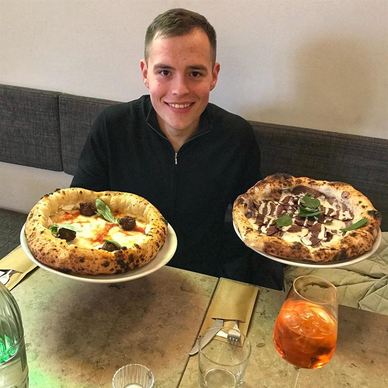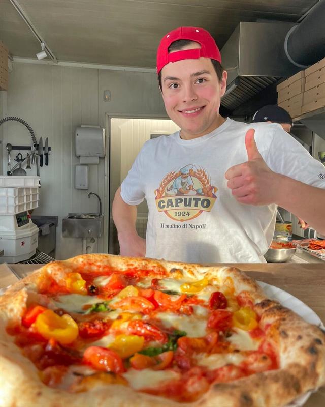 – Już jako dziecko lubiłem udawać, że gotuję. Brałem mały garnek, zbierałem w ogrodzie różne rzeczy i gotowałem z tego „zupę” – opowiada Melio Kosti. Na zdjęciu z pyszną pizzą własnego wyrobu. Fot. Facebook/melio_kosti