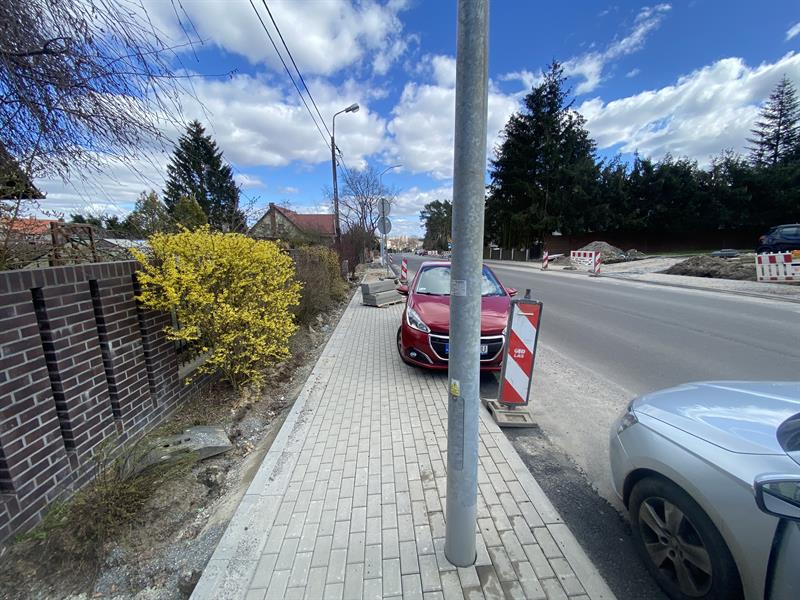 Napowietrzna linia energetyczna i podziemna infrastruktura wymusiły usytuowanie słupów na środku nowych chodników przy ulicach Modrej i Koralowej. Fot. Patryk JASKULSKI