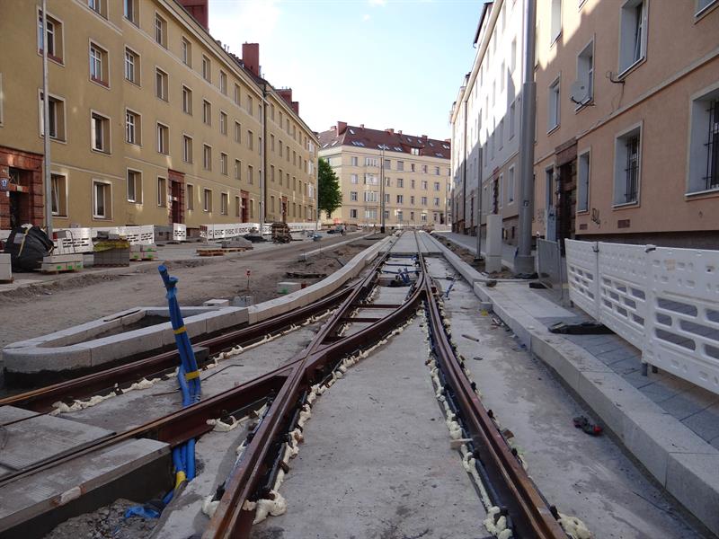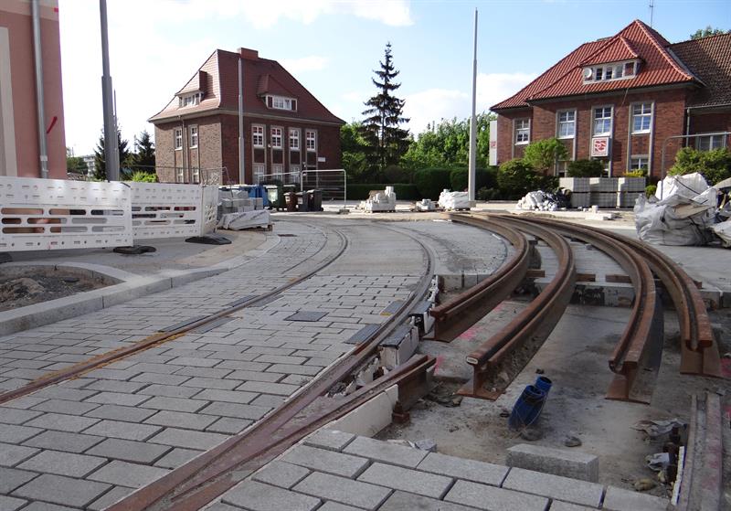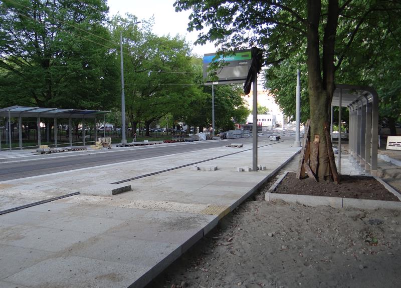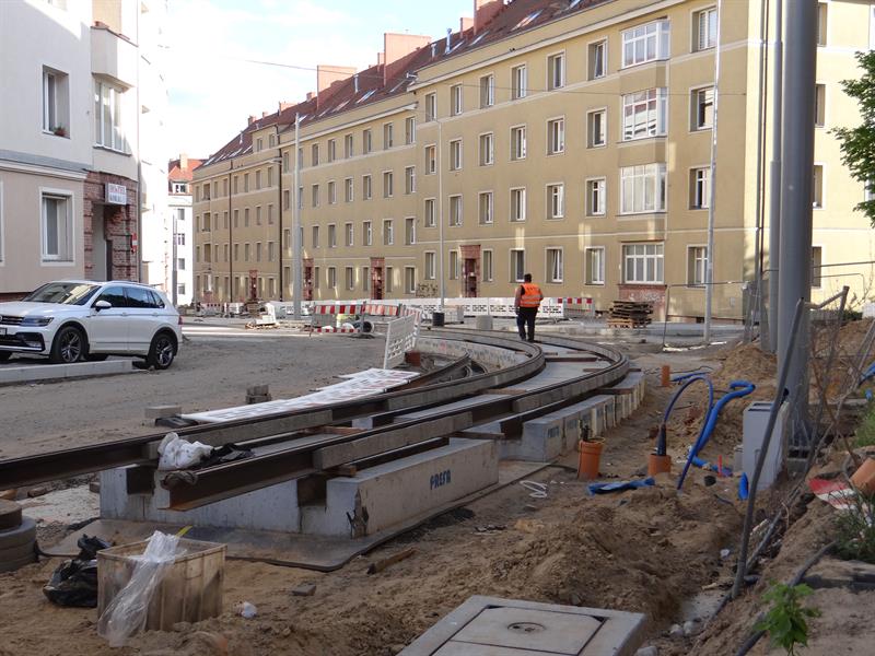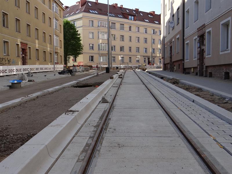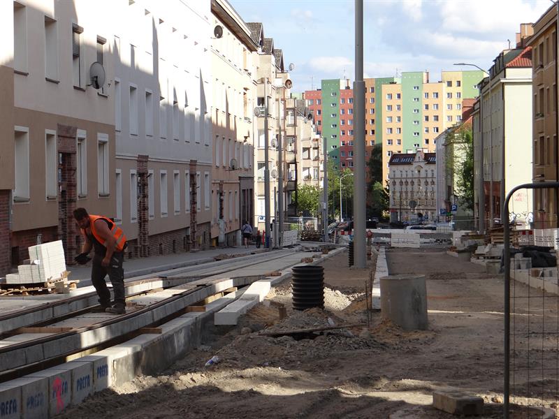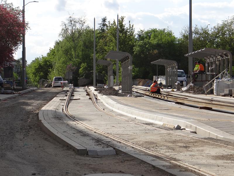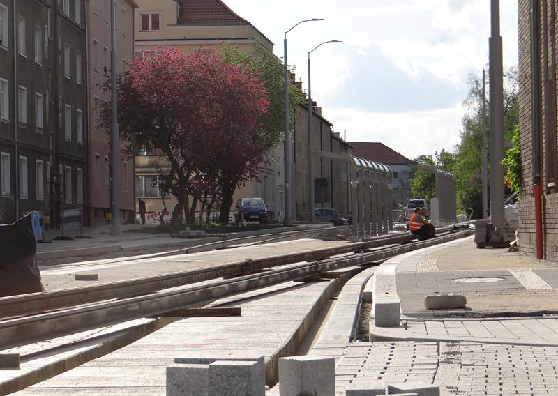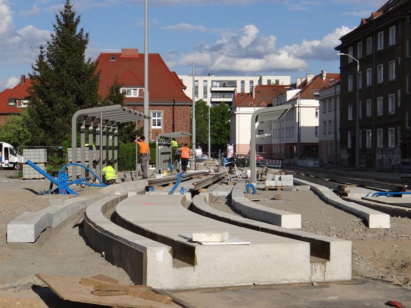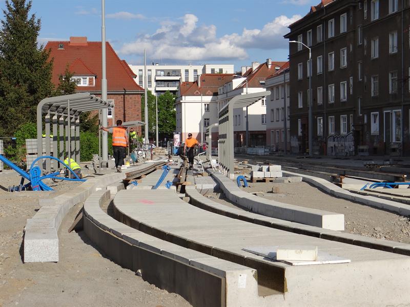 Duży poślizg, jaki notuje przebudowa układu drogowo-torowego na szczecińskim Niebuszewie-Bolinku od pętli przy ul. Orzeszkowej, przez ulice Boguchwały, Asnyka po odcinek ul. Kołłątaja, jeszcze się wydłuży. Zakres prac tego etapu inwestycji jest znacznie zaawansowany, ale nadal brak tam fragmentu nowego torowiska na łuku przy wyjeździe z nowej pętli przy ul. Orzeszkowej w ul. Boguchwały. A na wysokości urządzanych teraz nowych dwóch peronów przystankowych zespawane odcinki szyn szykowane są do ułożenia w prefabrykowanych profilach podbudowy z betonu.