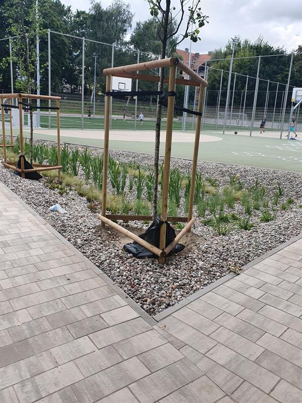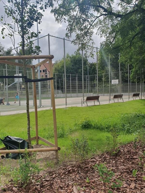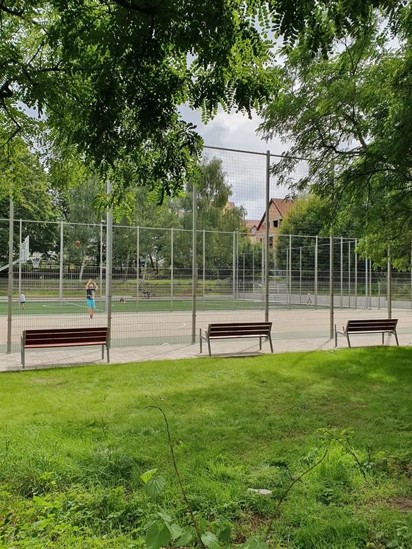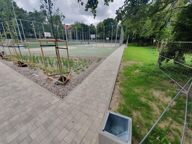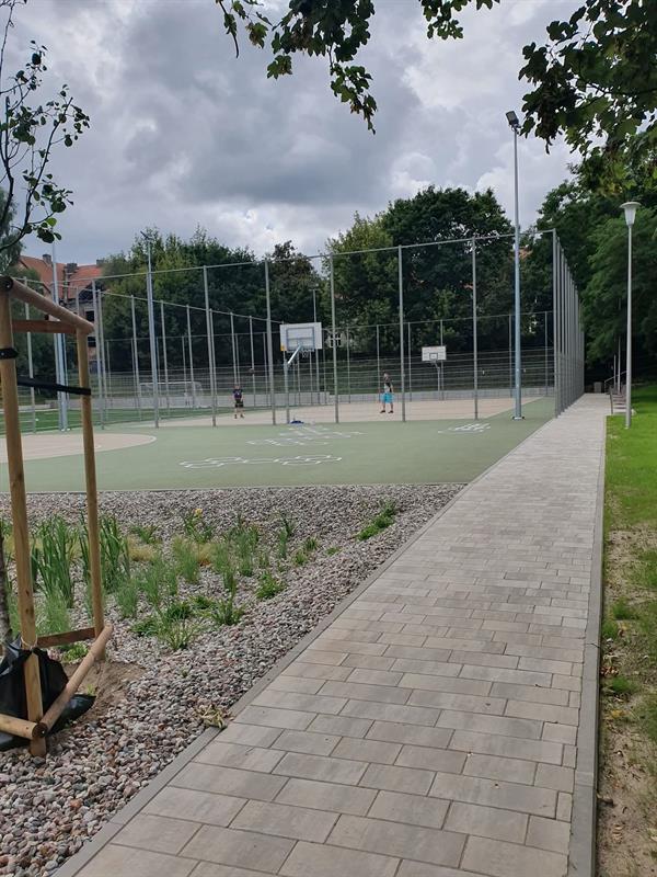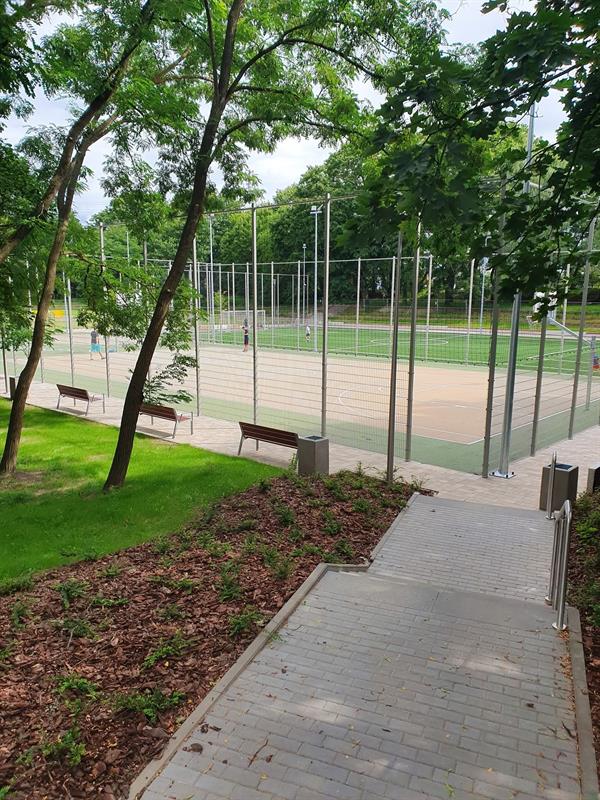 Jednak dopiero w tym roku rozpoczęła się jego realizacja. A właściwie pierwszego etapu - czyli budowa strefy sportowej z boiskami: wielofunkcyjnego do gry w koszykówkę i siatkówkę oraz odrębnego (40 x 21 m) do gry w piłkę nożną. W pół roku ten zakres inwestycji został zrealizowany. Wraz z otoczeniem, czyli ustawieniem ławek, budową ciągów komunikacyjnych oraz