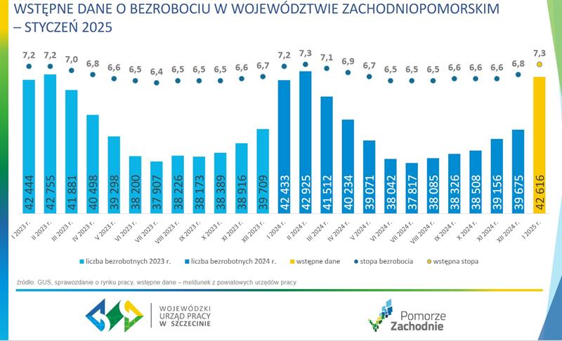 Według wstępnych informacji z powiatowych urzędów pracy liczba bezrobotnych w województwie zachodniopomorskim wyniosła 42 616 osób. Liczba zarejestrowanych w stosunku do danych z poprzedniego miesiąca zwiększyła się zatem aż o 7,4 proc. - o 2 941 osób.