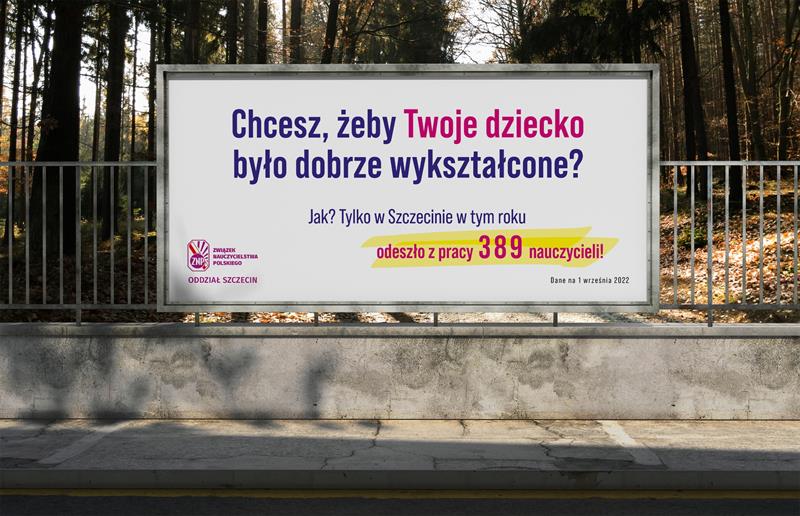 Na razie to tylko wizualizacja, ale w pierwszych dniach października na ruchliwych ulicach Szczecina pojawią się banery zwracające uwagę na problemy nauczycieli i zmiany w oświacie. m.in. z komunikatami o takiej treści: „Chcesz, żeby Twoje dziecko było dobrze wykształcone? Jak? Tylko w Szczecinie w tym roku odeszło z pracy 389 nauczycieli!”. Koszt banerów, plakatów i ulotek szczeciński oddział ZNP pokrył ze składek członkowskich. Fot. ZNP Szczecin