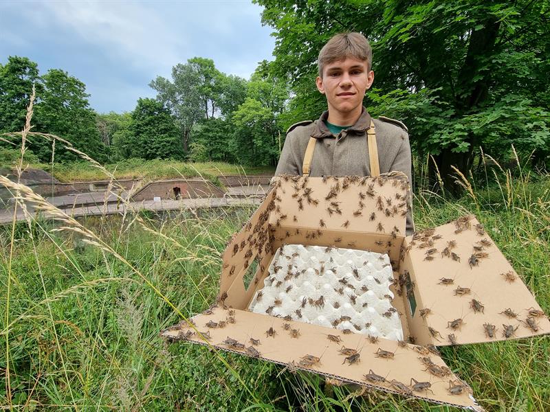 Na zdjęciu Nikodem Rusin, pasjonat historii z fortu, trzyma pudełko wypełnione świerszczami domowymi. To tylko część potężnej armii stawonogów, które w tym roku znalazły się na forcie.