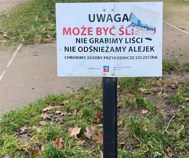 „Nie grabimy liści, nie odśnieżamy alejek. Chronimy zasoby przyrodnicze Szczecina" - właśnie wokół tablicy informacyjnej o tej treści, sygnowanej przez urzędników miasta, w parku „Przygodna" trwa… akcja grabienia liści. Co nie tylko mieszkańcy Gumieniec komentują: „Bareja by tego nie wymyślił!"