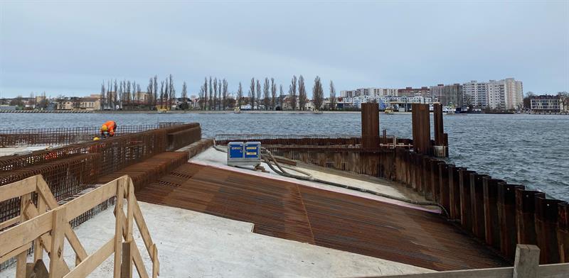 Konstrukcja hydrotechniczna łoża pod rampę oraz konstrukcja stalowa rampy przeładunkowej to kolejne elementy, które ostatnio się pojawiły na przebudowywanym nabrzeżu terminalu promowego w Świnoujściu. Prace przy powstającym w pobliżu nowym parkingu dla ciężarówek osiągnęły zaś półmetek. To inwestycje Zarządu Morskich Portów Szczecin i Świnoujście. Docelowo terminal zostanie przystosowany do obsługi transportu intermodalnego, czyli przewozu ładunków z wykorzystaniem różnych środków transportu.