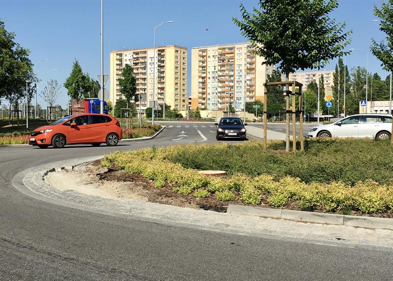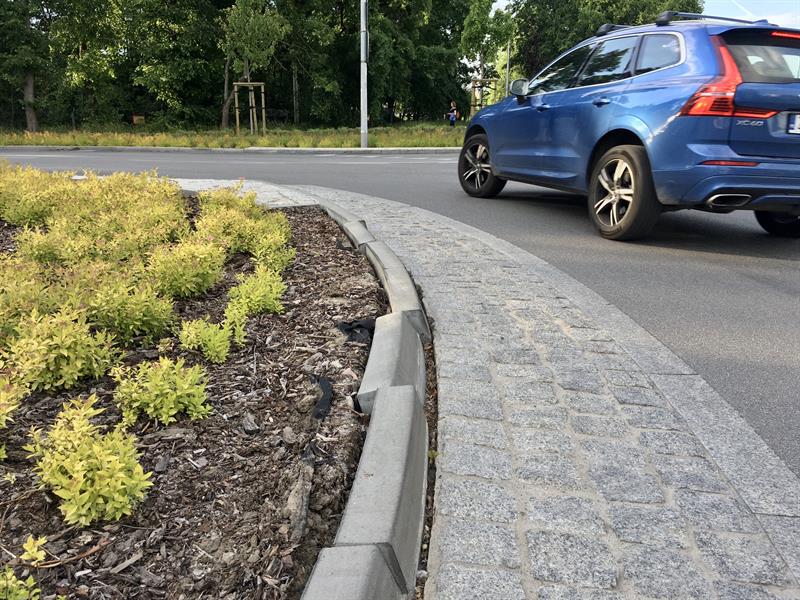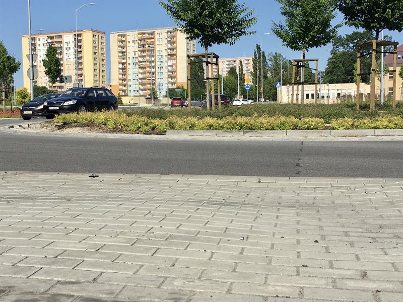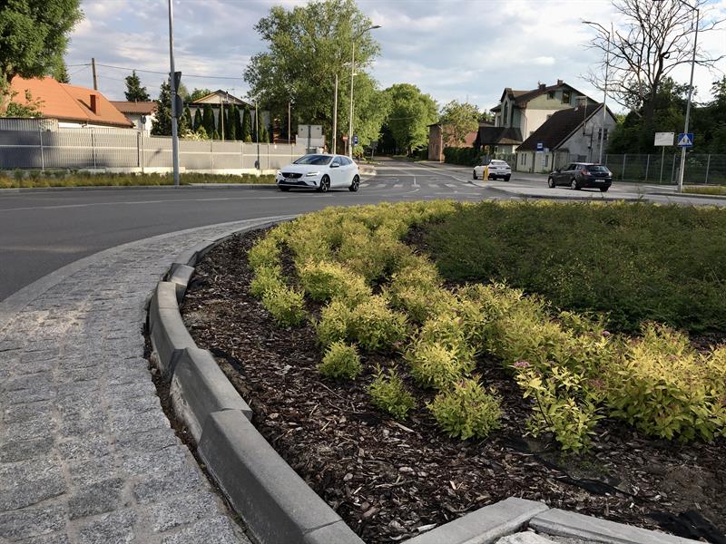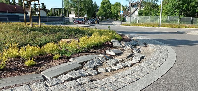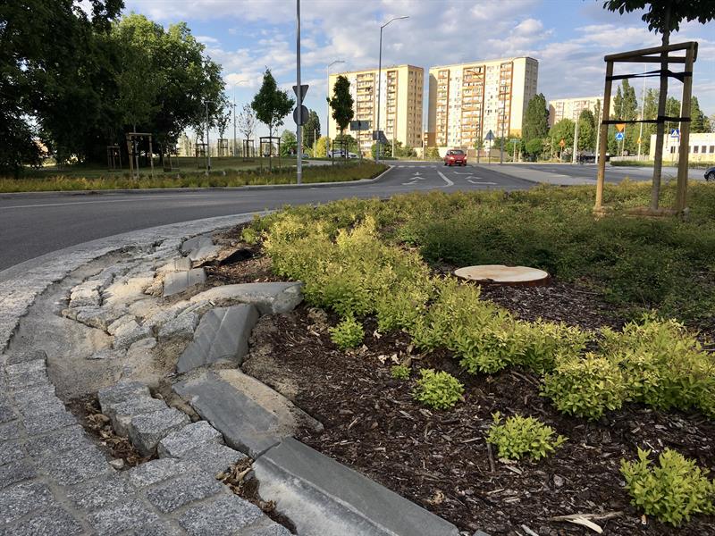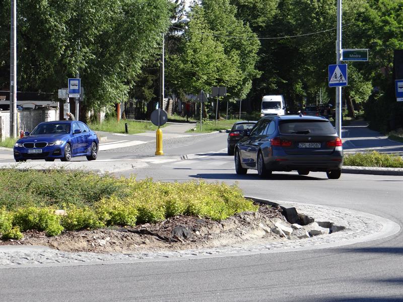 Najmniejsze z nowych rond na styku ulic Szafera, Szerokiej i Modrej jest na tyle małe, że duże samochody ciężarowe, a takich tam nie brak, zdążyły już zdemolować część jego wyspy wewnętrznej z okalającym ją kręgiem wyłożonym czterema rzędami małej kostki granitowej. Rozwalone są krawężniki, zajechane trawa i nasadzenia. I w tym stanie czeka cierpliwie na naprawę.