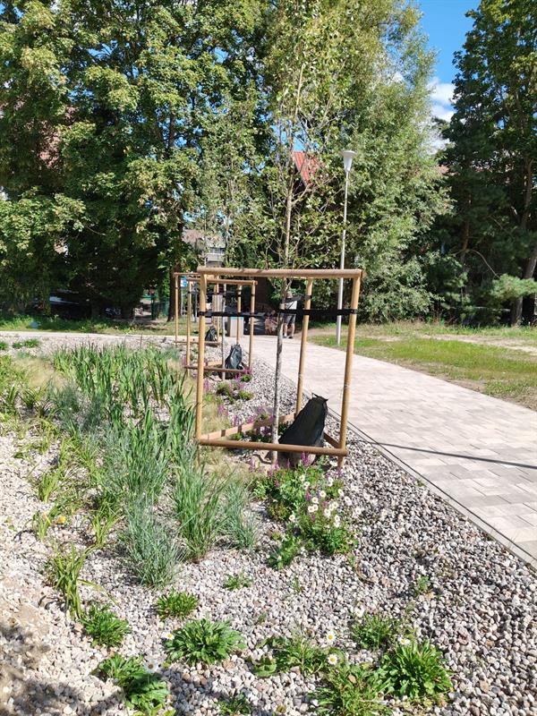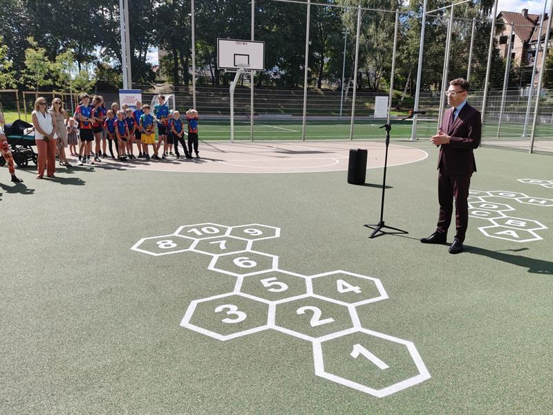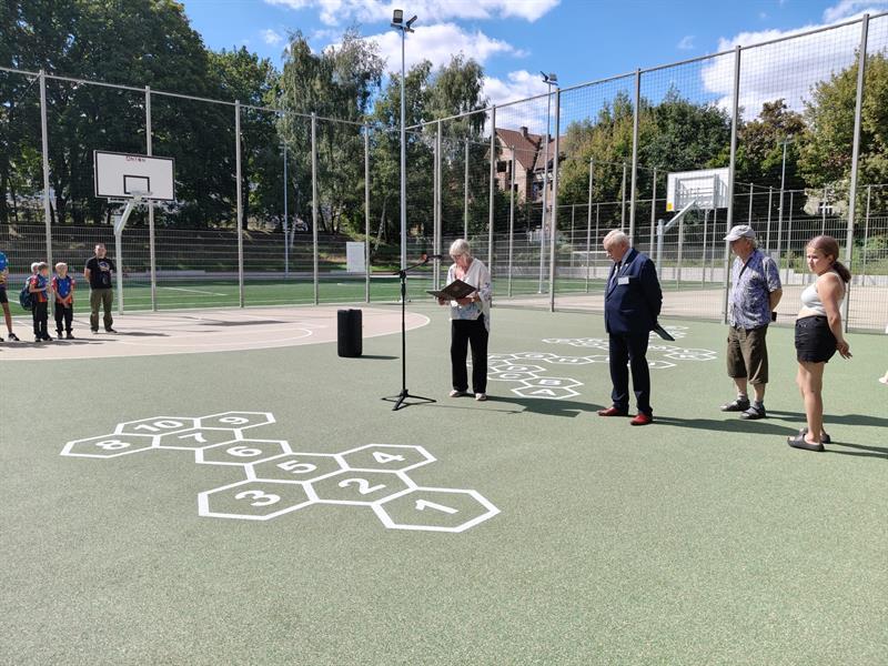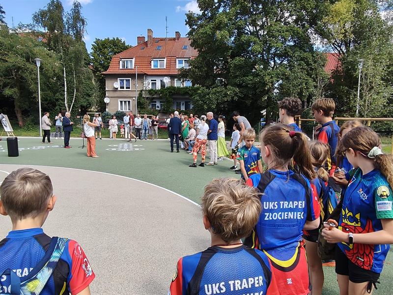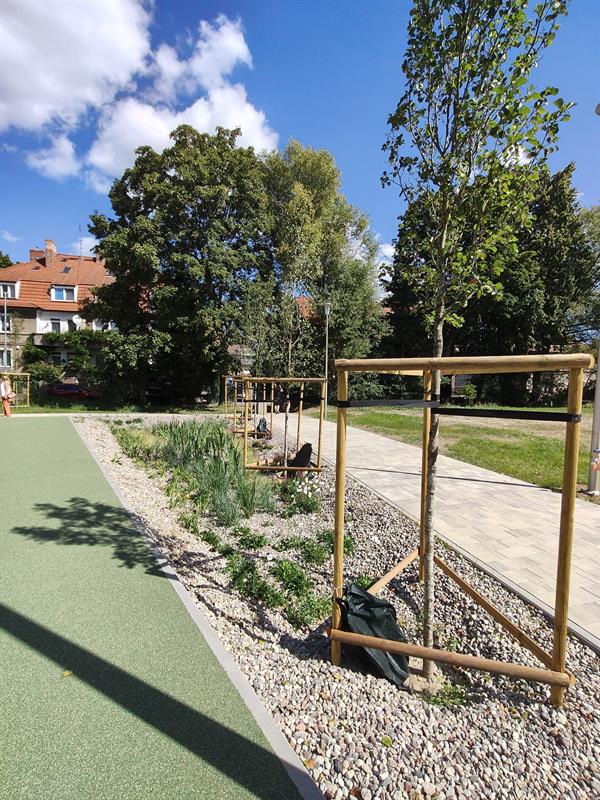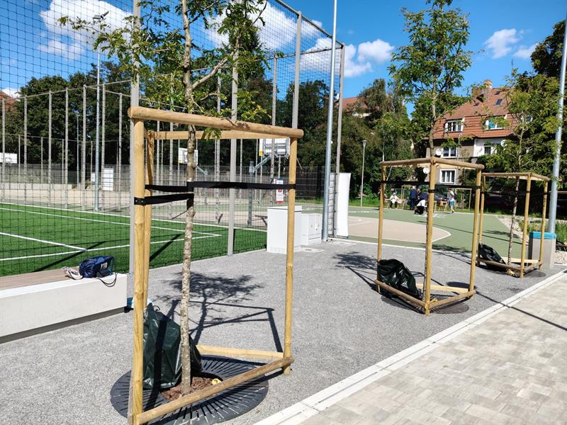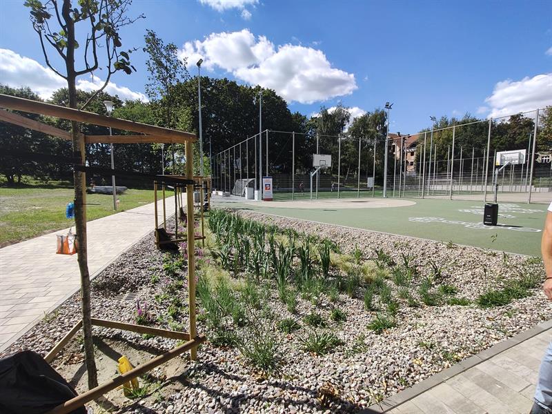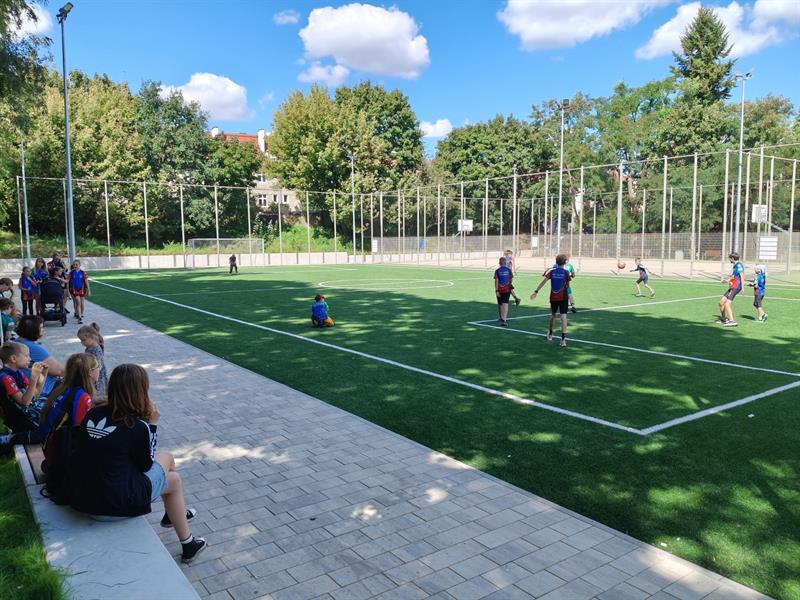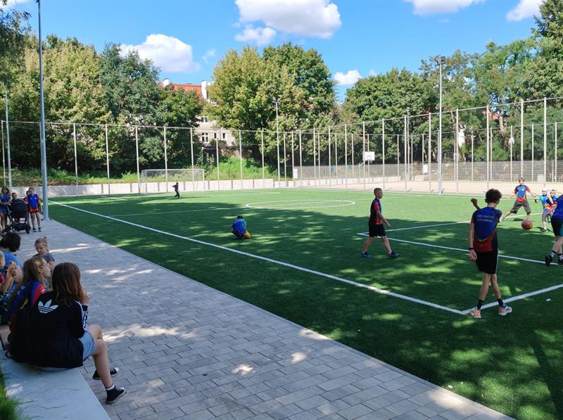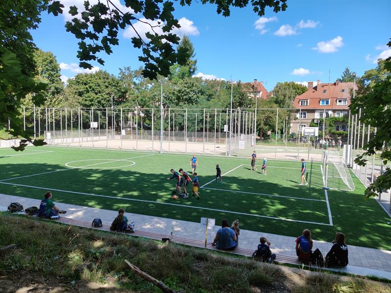 W pierwszym - niedawno zakończonym - etapie inwestycji powstały trzy boiska: do piłki nożnej oraz koszykówki, a także wielofunkcyjne - do ćwiczenia rzutów osobistych oraz tzw. gier chodnikowych. Całość otoczona piłkochwytami, ławkami, siedziskami, stojakami na rowery, a otoczona zielenią: na nowo zaaranżowanymi drzewami oraz ogrodem deszczowym, który