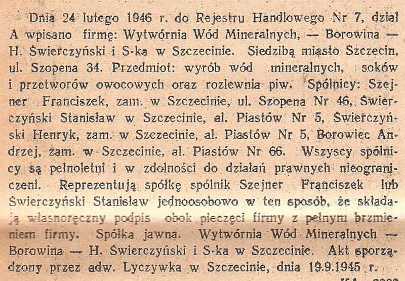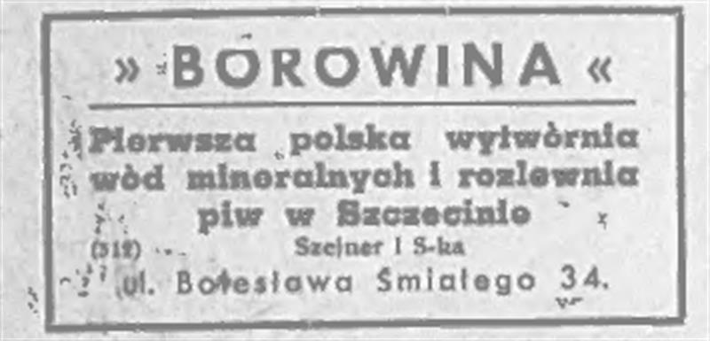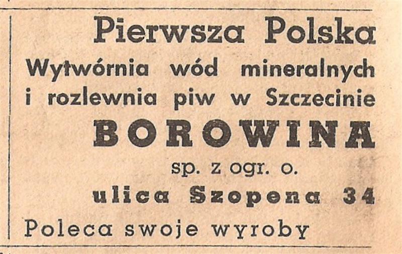W roku 1946 ukazała się broszura pt. „Polski Szczecin. Rys historyczny Pomorza Zachodniego. Chronologiczny przebieg wydarzeń w r. 1945/46". Jej autorzy tj. Piotr Zaremba i Czesław Piskorski opisywali pierwsze powojenne miesiące. Z broszury dowiadujemy się bardzo ciekawej rzeczy dotyczącej rozwoju gospodarczego miasta. Otóż pierwszą firmą, jaka rozpoczęła działalność w powojennym Szczecinie, była firma „Borowina". Tak pisał o tym Piotr Zaremba: „Razem z ekipami polskimi już w pierwszych dniach maja 1945 roku przybyli z Poznania do Szczecina również przedstawiciele przemysłu, których celem było uruchomienie zdewastowanych placówek niemieckich i jak najszybsze doprowadzenie życia gospodarczego miasta do pełnego rozkwitu. Oni to zajęli się
