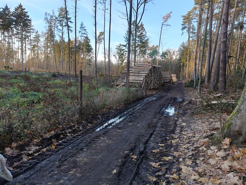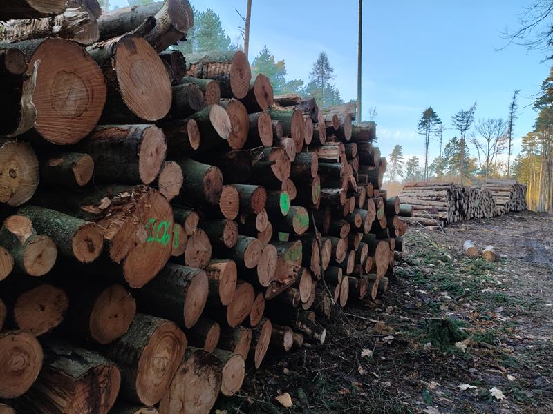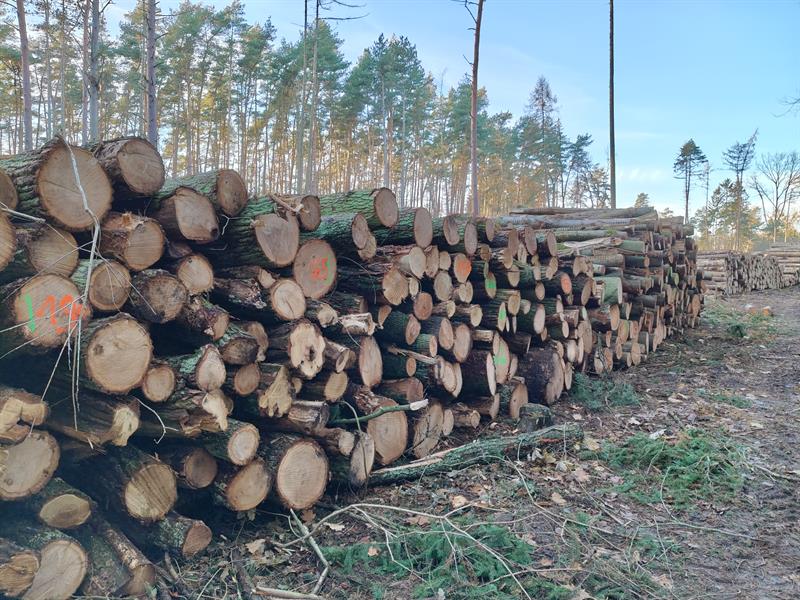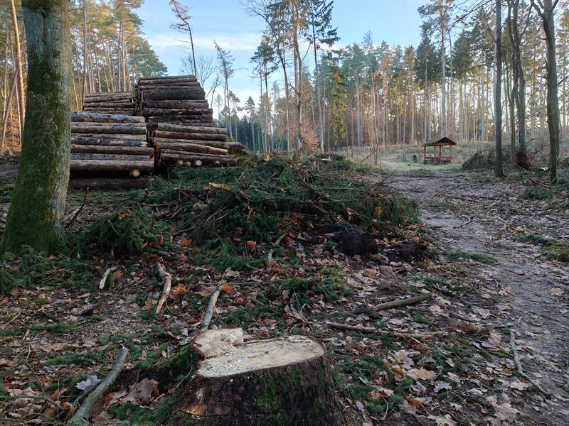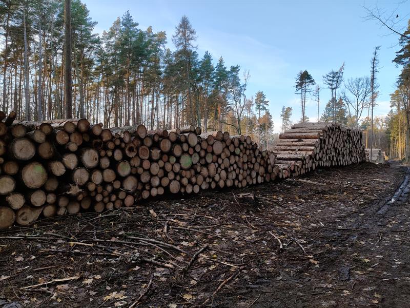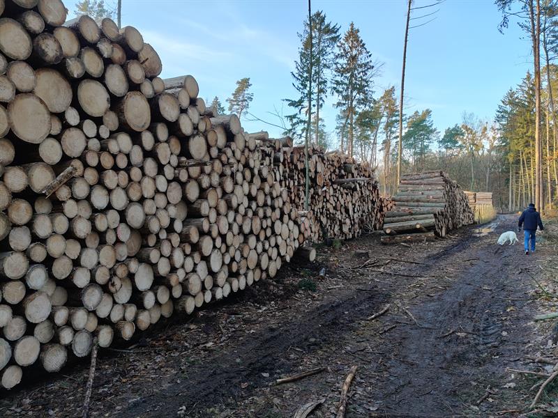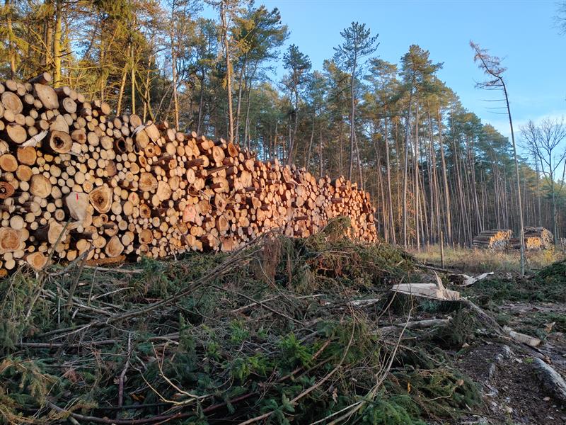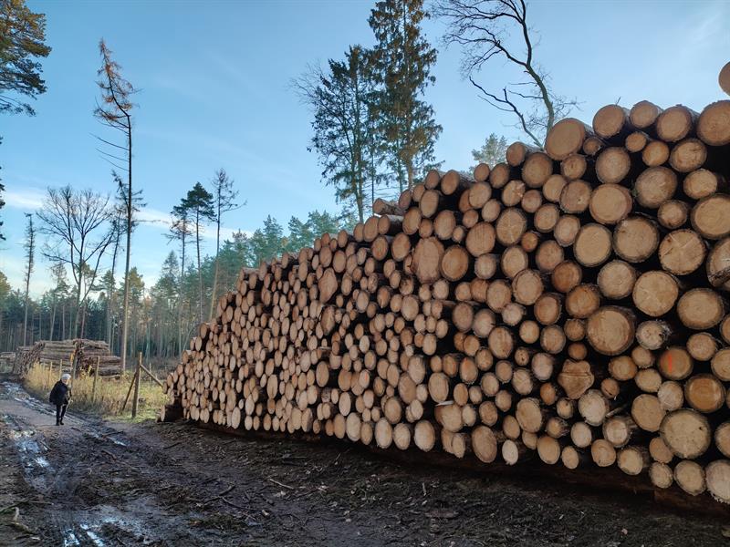 Wzdłuż kilku spacerowych tras ułożono stosy drewna. Miejscami sięgają ponad 4 metrów wysokości. To pnie ponad 1,5 tysiąca martwych drzew. Porażający obraz zniszczonego lasu o powierzchni około półtora hektara.