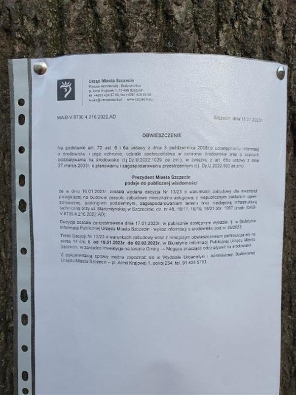 Obwieszczenie dotyczy zatwierdzenia projektu przebudowy części ul. Staromłyńskiej. Informuje, że została wydana decyzja o warunkach zabudowy dla inwestycji polegającej na budowie „zespołu zabudowy mieszkalno-usługowej z niepublicznym zakładem opieki zdrowotnej, parkingiem podziemnym, zagospodarowaniem terenu oraz niezbędną infrastrukturą techniczną przy ul. Staromłyńskiej w Szczecinie". Urząd komunikuje w nim także, gdzie i do kiedy można się zapoznać z treścią tej decyzji oraz z