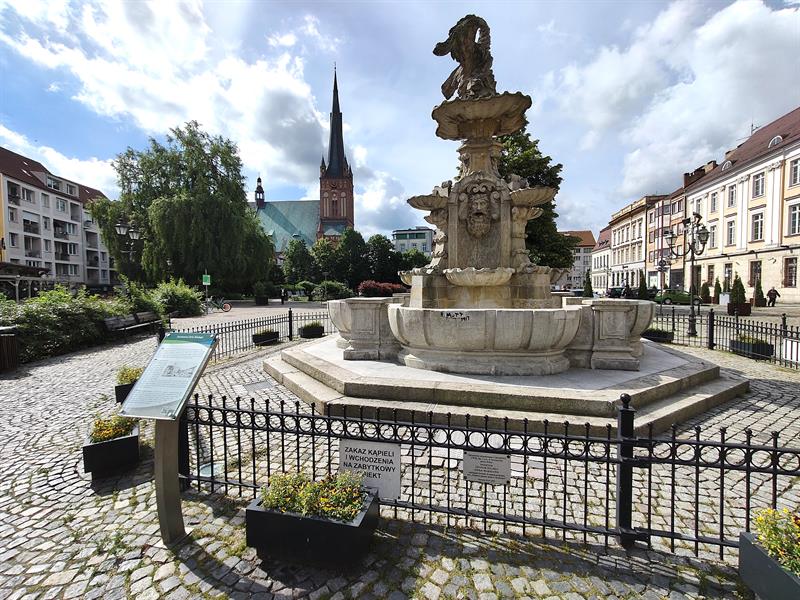 W fontannie na pl. Orła Białego woda trysnęła po raz pierwszy w 1732 r. Jej mechanizm opracował Johann Frederick Graël, a rzeźbę wykonali: Johann Conrad Koch z kamieniarzem Angererem. Pierwotnie stała tam, gdzie teraz znajduje się budynek restauracyjny, zajmowany wcześniej przez Polmozbyt (dawny Rynek Konny). Z obecnego miejsca nie była przenoszona od 1866 r. Jednak wkrótce - przy okazji przebudowy pl. Orła Białego - nastąpi jej relokacja. Najcenniejszy z zachowanych barokowych zabytków Szczecina trafi na dziedziniec Pałacu pod Globusem (d. Pałacu Grumbkowa), czyli do siedziby Akademii Sztuki, gdzie zostanie zabezpieczony zarówno przed negatywnym oddziaływaniem czynników atmosferycznych, jak i wandalami.