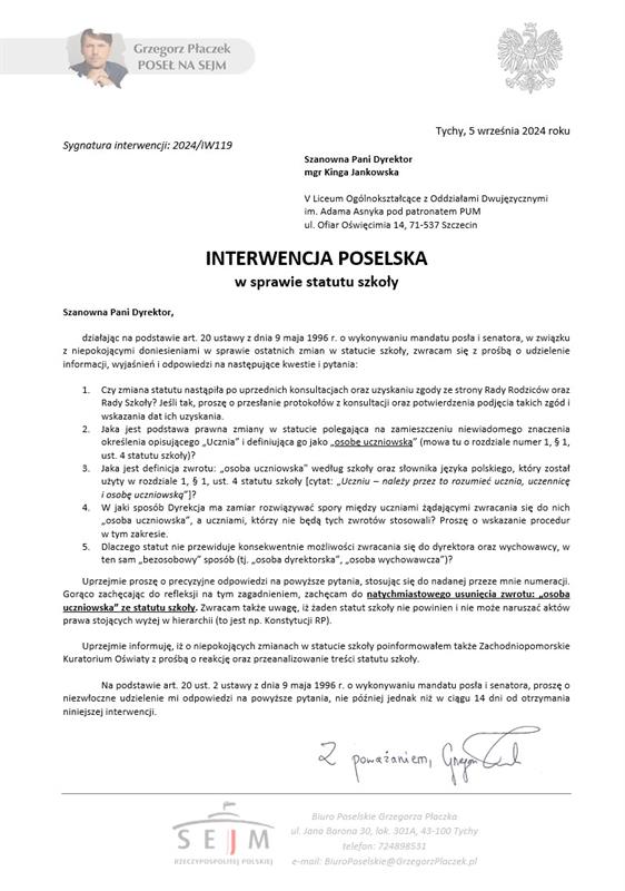 Zwrot „osoba uczniowska", który zbulwersował Grzegorza Płaczka, posła Konfederacji z Tych, wciąż widnieje w statucie V Liceum Ogólnokształcącego z Oddziałami Dwujęzycznymi w Szczecinie i nic nie wskazuje na to, by miał z niego zniknąć. Szkoła nie wypowiada się na ten temat, za to odpowiedź na interwencję poselską wystosowało Zachodniopomorskie Kuratorium Oświaty.