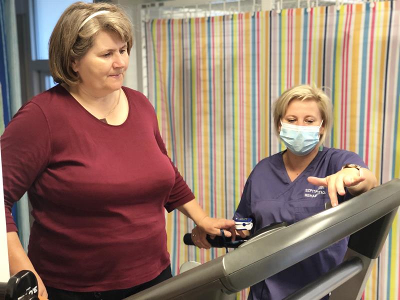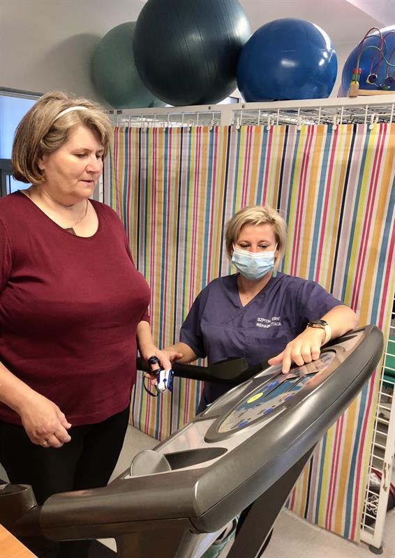 Na Dziennym Oddziale Rehabilitacyjnym szpitala „Zdroje" w Szczecinie realizowany jest program fizjoterapii dla osób po przebyciu COVID-19. Pierwsza pacjentka właśnie kończy 6-tygodniowy cykl terapii usprawniającej z rehabilitantami.