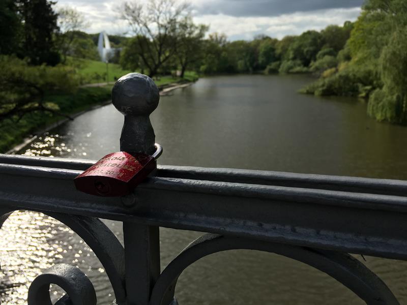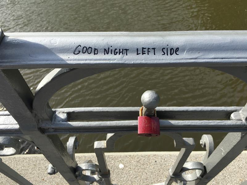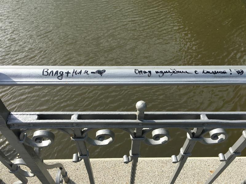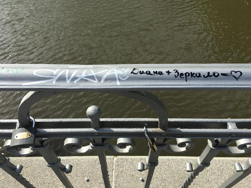 Nieznany sprawca czerwoną farbą oszpecił jeden z przyczółków mostu, bazgrząc na nim swój nikczemny podpis. Na balustradach anonimowi turyści zostawiają napisy w języku angielskim, rosyjskim, ukraińskim. Zakochane pary - wbrew zakazowi - nadal na mostku zawieszają kłódki.