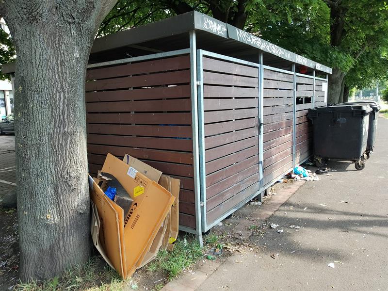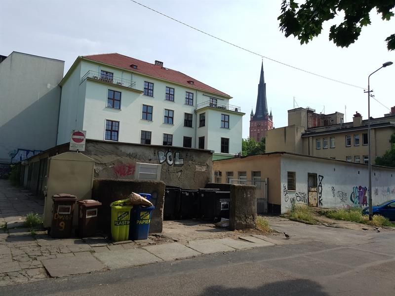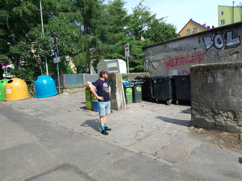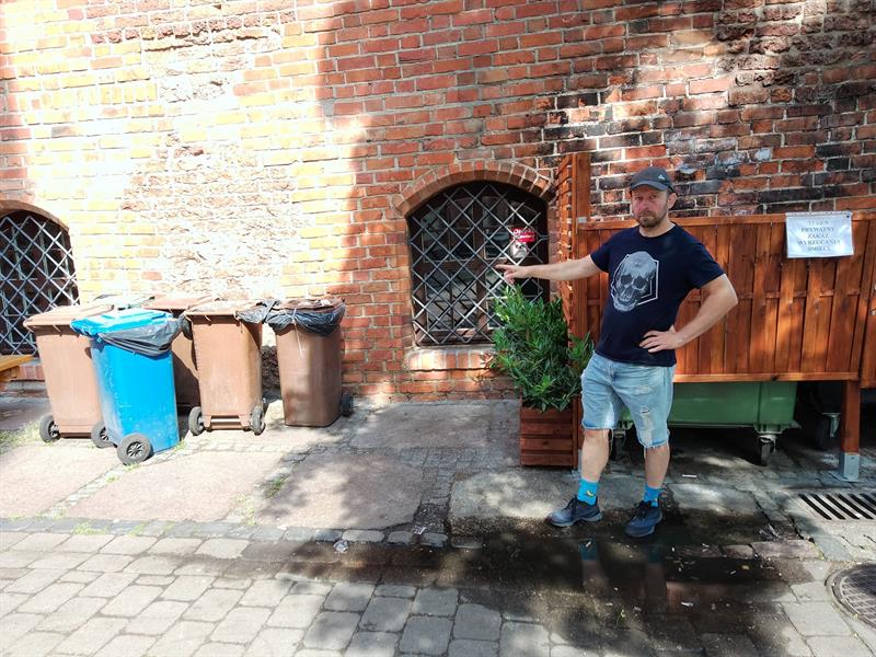 Wycieczkę zaczynamy od Starego Ratusza, na którego tyłach stoją niczym niezasłonięte kontenery na śmieci. Czuć od nich lekki odór. Obraz dopełnia stojąca kałuża, w której pływają niedopałki papierosów.