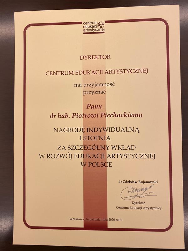 W tym miesiącu zbiegły się niezwykle ważne wydarzenia dla Piotra Piechockiego. Pierwszym z nich jest uroczystość wręczenia habilitacji w Akademii Muzycznej im. Stanisława Moniuszki w Gdańsku. Druga uroczystość odbyła się w Warszawie z okazji Dnia Edukacji Narodowej, na której dyrektor ZPSM odebrał z rąk ministra edukacji narodowej Dariusza Piontkowskiego tytuł Honorowego Profesora Oświaty. To wielkie wyróżnienie otrzymały w tym roku zaledwie trzy osoby ze szkolnictwa artystycznego w Polsce. Trzecim natomiast wydarzeniem było wręczenie profesorowi Nagrody I stopnia Dyrektora Centrum Edukacji Artystycznej za szczególny wkład w rozwój edukacji artystycznej w Polsce.