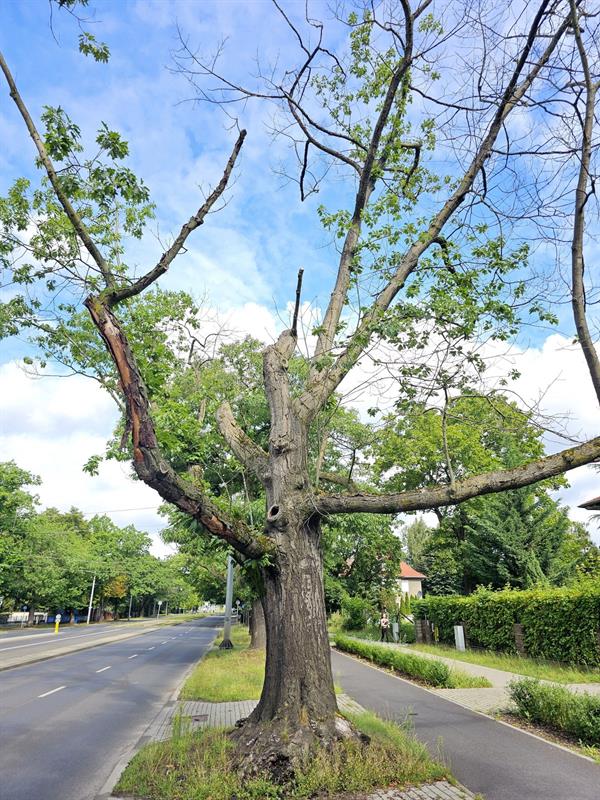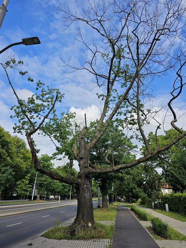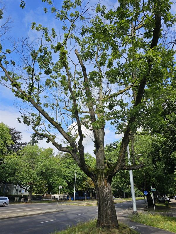 Zamierają kolejne z pomnikowych czerwonych dębów w rejonie Węzła Łękno, które trwały w tym miejscu przez niemal 100 lat. Tak wartościowy starodrzew „odreagowuje" błędy projektowe i naruszenia w obrębie brył korzeniowych jednej z największych i najważniejszych inwestycji drogowych ostatnich lat w Szczecinie.