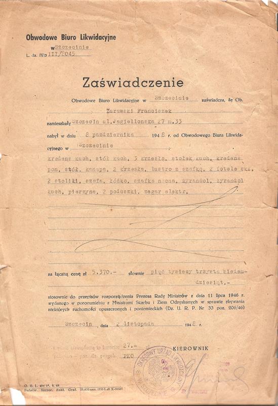 W rodzinnych papierach zachował się dokument poświadczający fakt nabycia przez ob. (obywatela) Franciszka Żurawskiego różnego rodzaju mebli będących mieniem poniemieckim. Tata zapłacił za nie gotówką kwotę 5370 zł. Wśród mebli są m.in. stół i 2 stoliki. Jest też kanapa.
