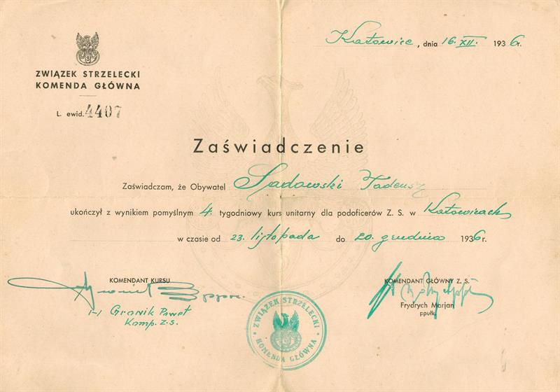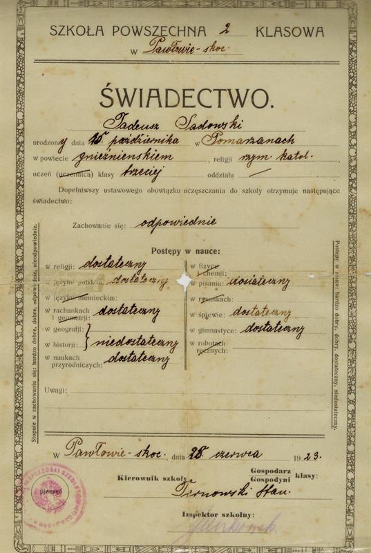 Lata chłopięce mojego ojca upłynęły w Pomorzanach i Pawłowie, pod zaborem pruskim. Zaborem pruskim, a właściwie w Związku Północnoniemieckim, do którego wcielono Poznańskie pod rządami „Żelaznego Kanclerza" Rzeszy - Bismarcka. Wielkopolanie toczyli w tym czasie z Prusami „Najdłuższą wojnę nowożytnej Europy", z której w większości wyszli zwycięsko. Czteroklasową szkołę podstawową ojciec Tadeusz kończy w Pawłowie w 1923 r. Do czasu powołania do wojska ojciec Tadeusz pozostaje przy rodzicach, pomagając im we wspólnym gospodarstwie domowym. Czynną służbę wojskową odbywa w latach 1931-32 w Bydgoszczy w 61. p. w 1. p i 3. kompani CKM.