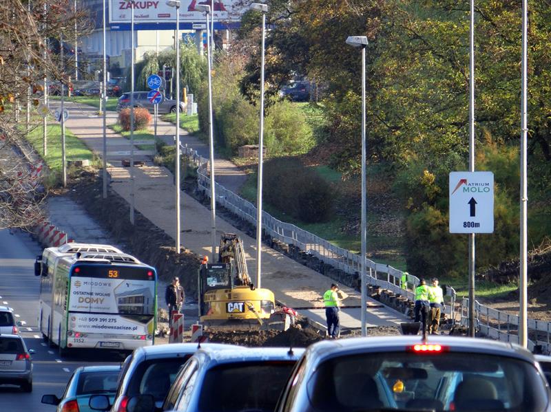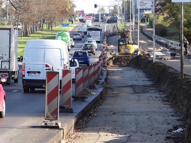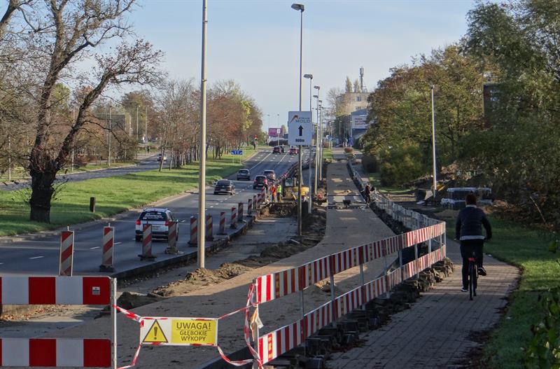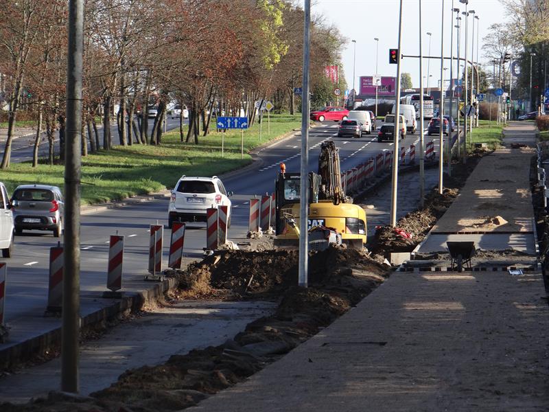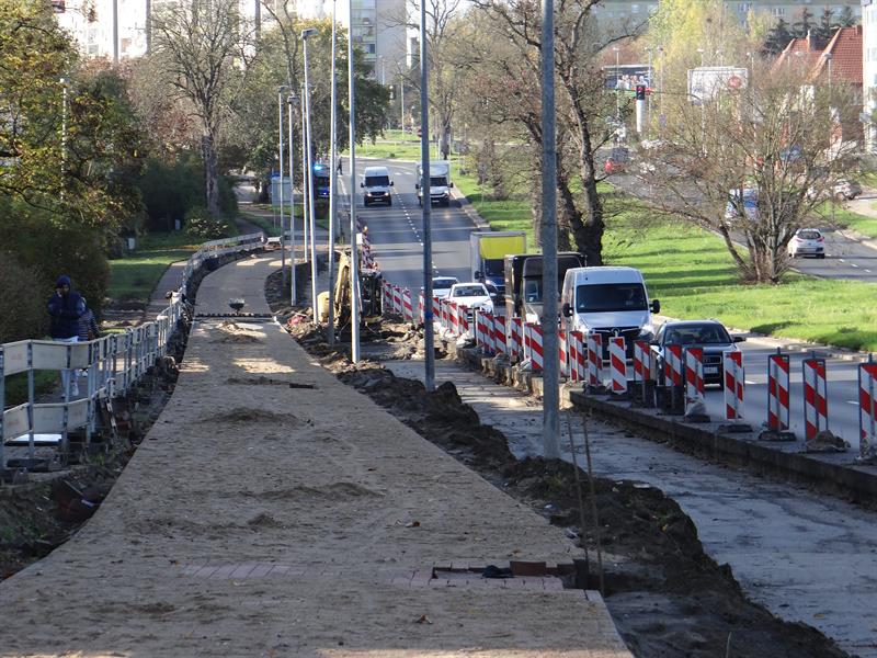 Obecnie na ukończeniu są tam prace brukarskie na fragmencie odtwarzanej drogi dla jednośladów. Pojawiła się też pierwsza z warstw podbudowy pod jezdnię.