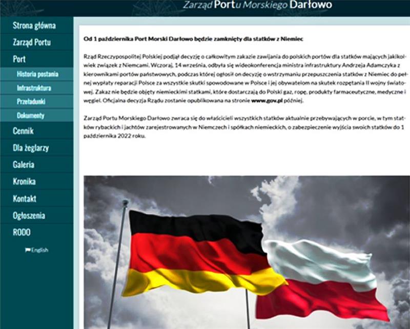 „Rząd Rzeczypospolitej Polskiej podjął decyzję o całkowitym zakazie zawijania do polskich portów dla statków mających jakikolwiek związek z Niemcami. Wczoraj, 14 września, odbyła się wideokonferencja ministra infrastruktury Andrzeja Adamczyka z kierownikami portów państwowych, podczas której ogłosił on decyzję o wstrzymaniu przepuszczania statków z Niemiec do pełnej wypłaty reparacji Polsce za wszystkie skutki spowodowane w Polsce i jej obywatelom na skutek rozpętania II wojny światowej. Zakaz nie będzie objęty niemieckimi statkami, które dostarczają