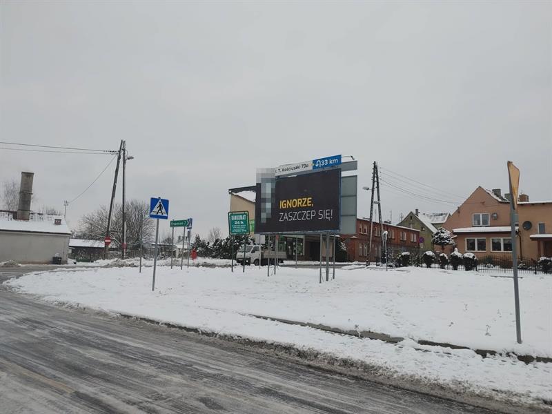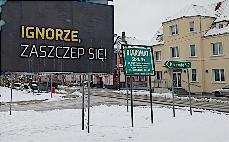 Pierwsze dwa wielkie plakaty zawisły kilka dni temu przy drodze w Dobrzanach, pow. stargardzki. Tam przyjaciel panów Huberta i Rafała ze Stargardu jeździ dość często w odwiedziny do krewnych. Traf chciał, że tamtejszy przydrożny stojak reklamowy mieli akurat wolny. Prowadzą agencję reklamową. Nakleili z obu stron wielki plakat, który opatrzyli napisem „Ignorze, zaszczep się!".