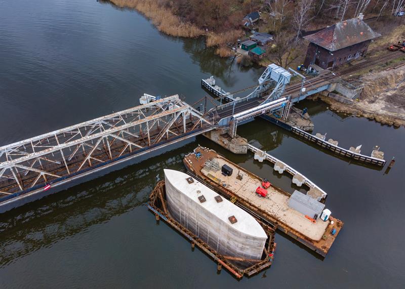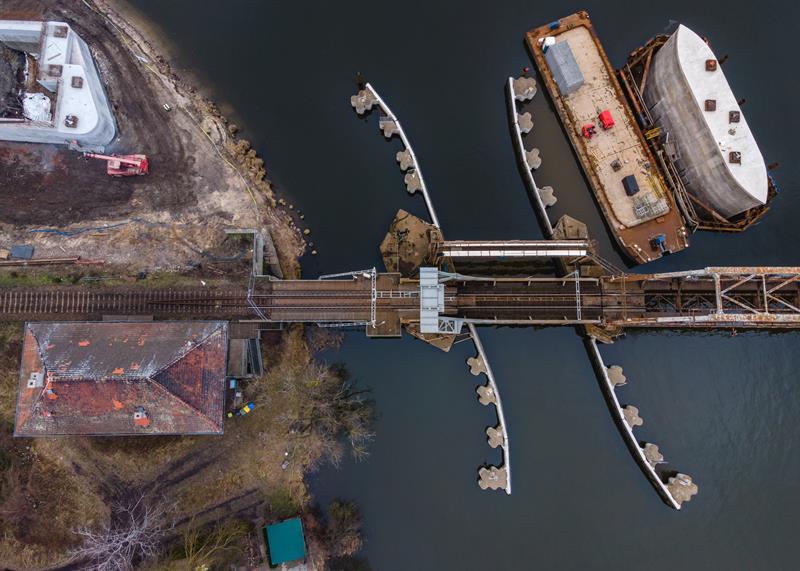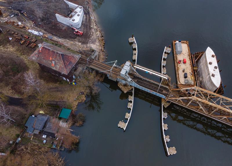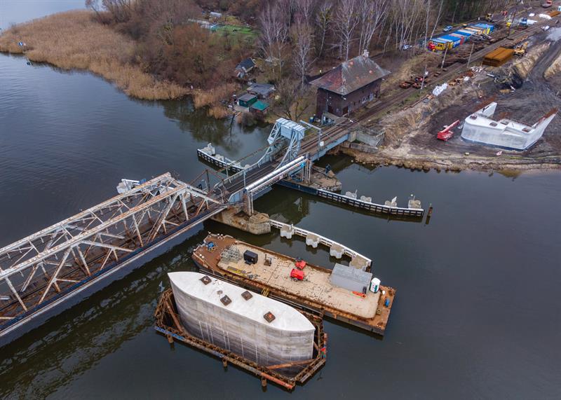 - Powstał w 1877 r. i do niedawna był jedynym czynnym zwodzonym mostem kolejowym w Polsce, a jednocześnie jedynym w Europie z napędem mechanicznym. Początkowo miał przęsło obrotowe. W trakcie II wojny światowej został zburzony, a po odbudowaniu stał się mostem zwodzonym. Koncepcja obecnie trwającego projektu przewiduje zachowanie zwodzonego przęsła o długości ok. 17,5 m wraz z przynależną