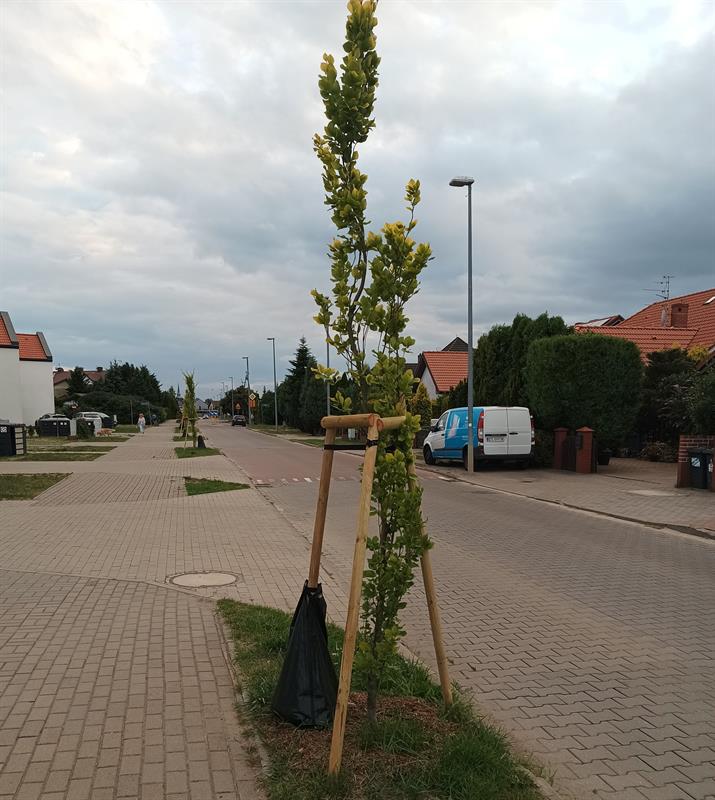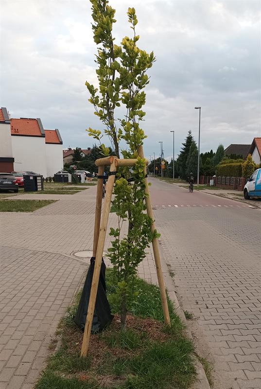 Drzewa zostały posadzone w pasie drogowym. Zgodnie za standardami, przy każdym zamontowano paliki stabilizujące i hydrobufory, czyli worki do nawadniania.