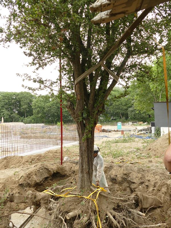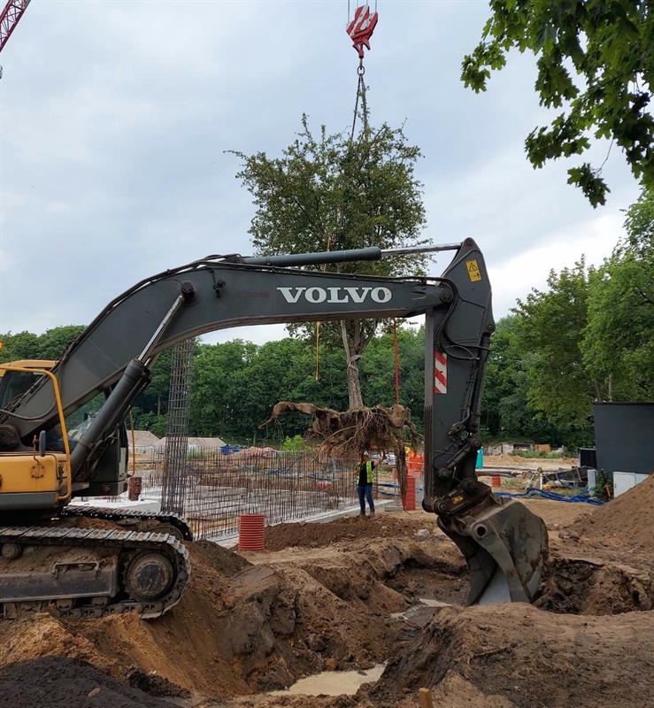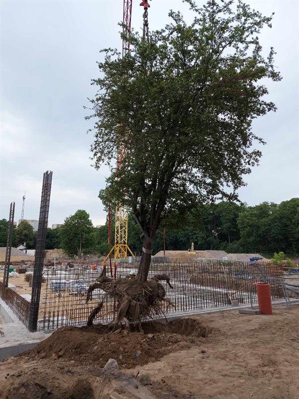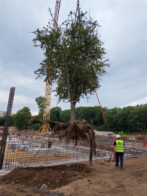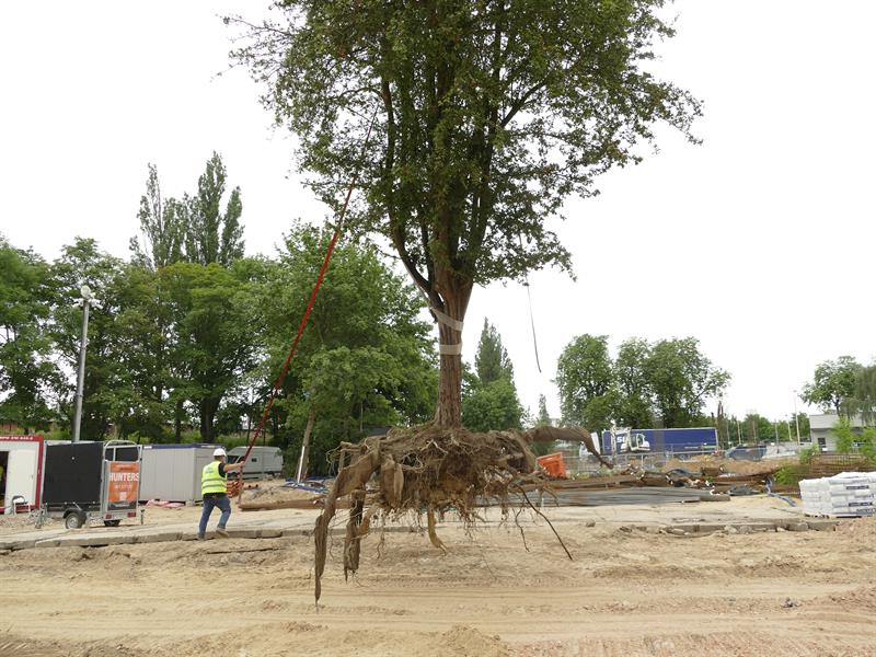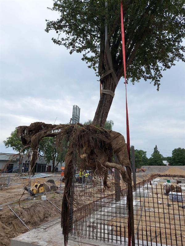 Załatwia to dwóch ludzi i koparka z łyżką jak do nakładania kulek lodów - drzewo wraz z bryłą korzeniową i ziemią jest wyjmowane z gruntu i przewożone na miejsce - normalna operacja bez zainteresowania mediów...