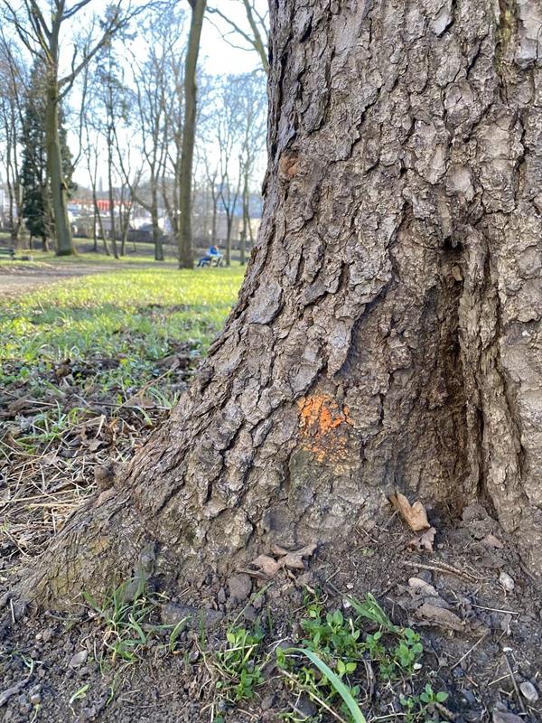 Trudno zauważyć czerwone znaki na pniach drzew, bo zrobiono je dyskretnie, blisko gruntu. Dlatego nawet okoliczni mieszkańcy - z ulic Hożej, Wendeńskiej, Retry, Studziennej i Zgorzeleckiej - nie mają pojęcia, że ich park czeka pogrom wśród drzew. Urzędnicy miasta zaplanowali wycinkę 43 okazów starodrzewia.