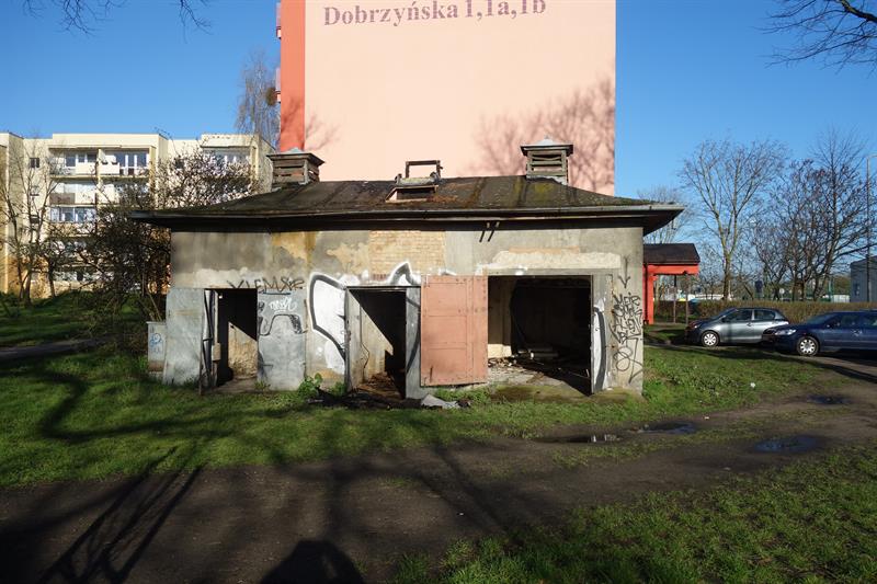 Pisaliśmy o tych ruinach niejednokrotnie, ostatnio przy okazji pożaru pozostałości garażu przy pętli na ulicy Dobrzyńskiej. Budynek-ruina stoi na terenie działki miejskiej oznaczonej symbolem 10/10. Przylega do innego nieużywanego obiektu, którym jest tzw. trafostacja. Stoi ona już na terenie należącym do SM „Kolejarz" - jest to działka nr 29/7.