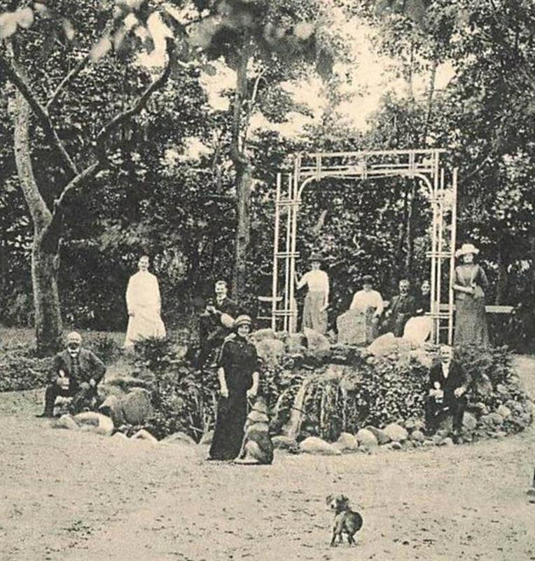 Na zdjęciu z początku wieku widać postacie w strojach z epoki, pergolę, bujną zieleń, a też wodę wypływającą spomiędzy kamieni ułożonych w formie wyspy otoczonej fosą. To fontanna Rudolfa, której dawny kształt starali się przywrócić społecznicy pod egidą Pomorskiego Towarzystwa Historycznego.