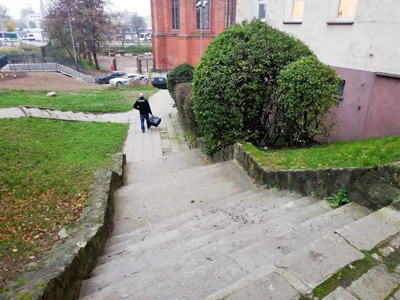 W listopadzie na łamach „Kuriera" opisaliśmy przypadek deweloperskiej inwestycji przy ul. Świętego Ducha, której elementem - narzuconym przez miasto - była konieczność wybudowania tzw. nawrotki dla wozów straży pożarnej (pt. Schody (nie) do pokonania). W tym celu inwestor musiał przebudować część skarpy oraz schody prowadzące w stronę ul. Wyszyńskiego. Co zrobił. Tyle że strome schody pozbawione zjazdów dla wózków stały się architektoniczną barierą dla osób niepełnosprawnych oraz dziecięcych wózków.
