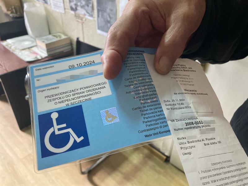 Pan Andrzej pod koniec listopada wybrał się na zakupy do dyskontu przy al. Piastów w Szczecinie. Zaparkował swój samochód przy sklepie, zostawiając za szybą w widocznym miejscu kartę dla osób niepełnosprawnych. To międzynarodowy dokument, który uprawnia jego posiadacza do parkowania pojazdów bez ponoszenia dodatkowych kosztów. Dlatego mężczyznę bardzo zaskoczył mandat zostawiony przez kontrolera, jaki zastał po zrobieniu zakupów. Karą za - jak czytamy - „brak w widocznym miejscu pod przednią szybą ważnego biletu parkingowego (również uprawniającego do bezpłatnego parkowania)", jest grzywna w wysokości 90 lub 150 zł, w zależności od terminu spłaty. To pierwsza taka sytuacja, jaka spotkała pana Andrzeja, który od lat bez problemów posługiwał się dokumentem uprawniającym do bezpłatnego korzystania z postojów.