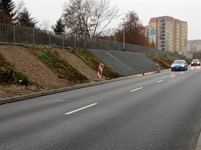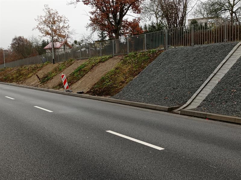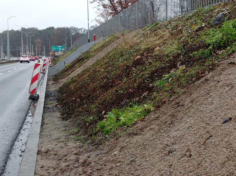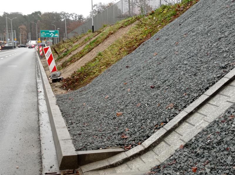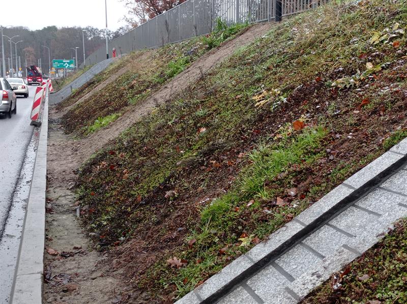 Osiatkowaną z wierzchu warstwę tłucznia, którym wypełniono geokratę wcześniej zamocowaną w ziemi, podziwiać będziemy w centralnej części, czyli w największym przewyższeniu zbocza o największym kącie nachylenia do biegnącej poniżej jezdni. A pozostałe łachy piachu po wyrównaniu podłoża zostaną ponownie zazielenione - wyłożone nowymi matami rozchodników. Warunki klimatyczno-pogodowe o tej porze roku na razie nie sprzyjają takim nasadzeniom. Kolejne mocowanie mat z roślinami do gruntu na razie zostało odłożone.