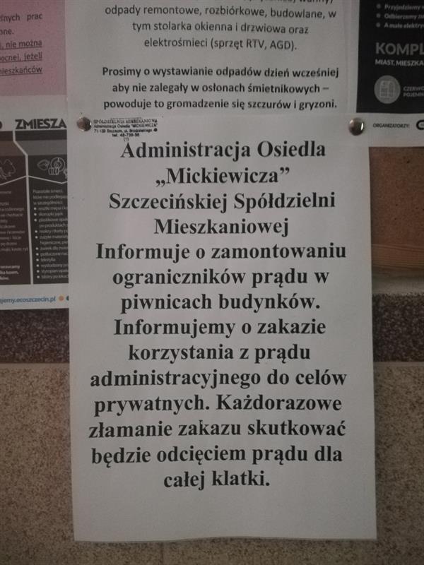 Koniec z darmowym zasilaniem kosiarek elektrycznych, prywatnych zamrażarek, lodówek, szlifierek, grillów… Coraz więcej zarządców nieruchomości wprowadza ograniczenia związane z dostępem do prądu z części wspólnych - klatek schodowych, piwnicy. Zrobiła to właśnie Szczecińska Spółdzielnia Mieszkaniowa na osiedlu „Mickiewicza". Nie wszystkim to się spodobało, zwłaszcza że pierwsza informacja przekazana przez administratora mówiła nawet o możliwości „odcięcia prądu dla całej klatki".