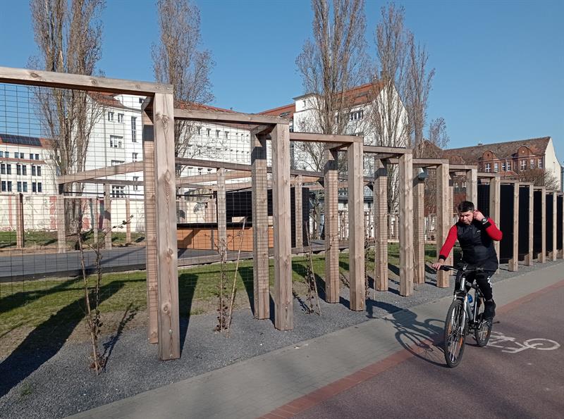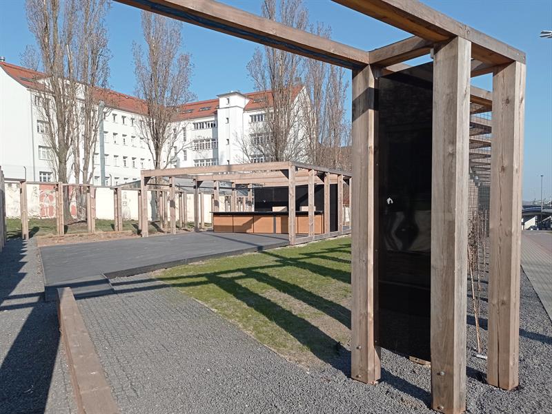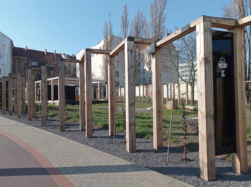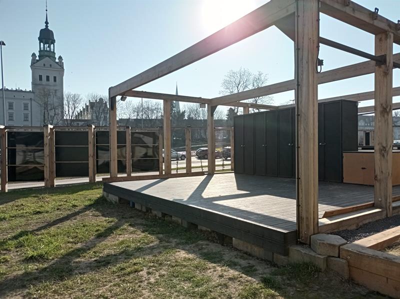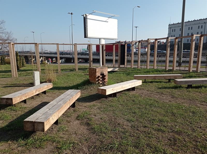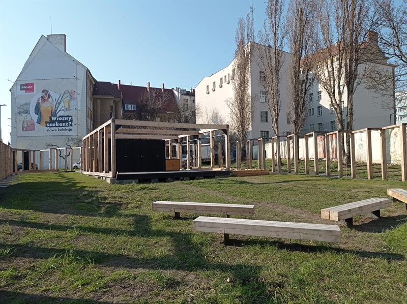 Lekka drewniana konstrukcja pergoli zaprasza do wejścia w głąb patio, gdzie plenerowa scena łączy się z ogrodowym barem. Na dziko rosnącej łące, która w pełni rozkwitnie zapewne dopiero w maju, stanęły długie ławy z drewnianych bali oraz murowane palenisko. To świetnie zaplanowana baza dla przyszłych plenerowych imprez. Przestrzeń, w której każdy będzie mile widziany. „Zestawienie idei «greckiego forum» i «powrotu do natury» uzyskanej przy pomocy subtelnego tymczasowego, architektonicznego działania" - jak to widzieli pomysłodawcy tegoż projektu SBO. Przekształcając ów fragment miasta w „funkcjonalne, wyodrębnione za pomocą estetycznej, lekkiej architektury, miejsce przeznaczone do przyjemnego spędzania czasu, integracji i uczestnictwa w
