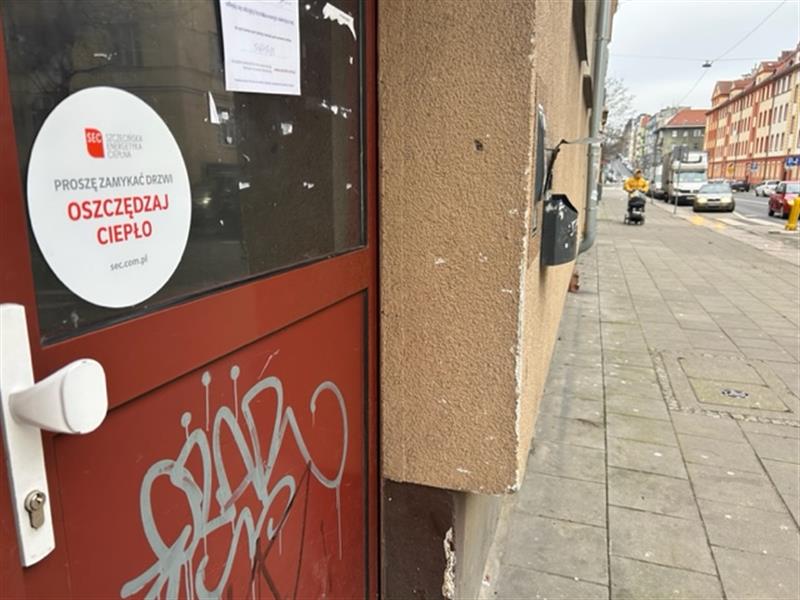 Na drzwiach wejściowych do wielu szczecińskich budynków widać naklejkę z wydrukowanym na czerwono napisem „Proszę zamykać drzwi. Oszczędzaj Ciepło”. Fot. Roman CIEPLIŃSKI