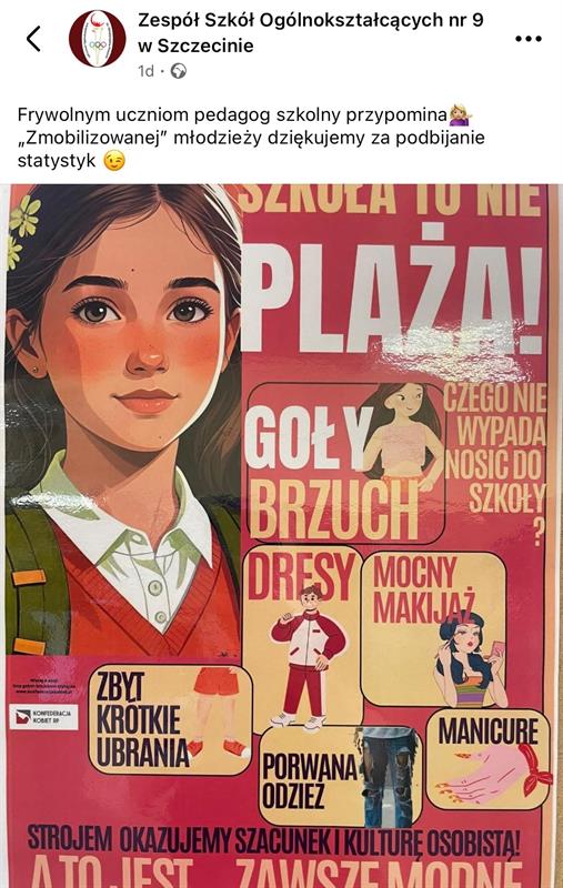 „Szkoła to nie plaża! Czego nie wypada nosić do szkoły" - czytamy na plakacie, który Zespół Szkół Ogólnokształcących nr 9 w Szczecinie umieścił na swoim oficjalnym Facebooku. Plakat sugeruje, w jaki sposób powinni ubierać się do szkoły uczniowie. Kontrowersje u niektórych wzbudziła jednak nie tyle treść grafiki, ile logotyp organizacji, który się na nim znajduje - to powiązana z Ordo Iuris Konfederacja Kobiet RP.