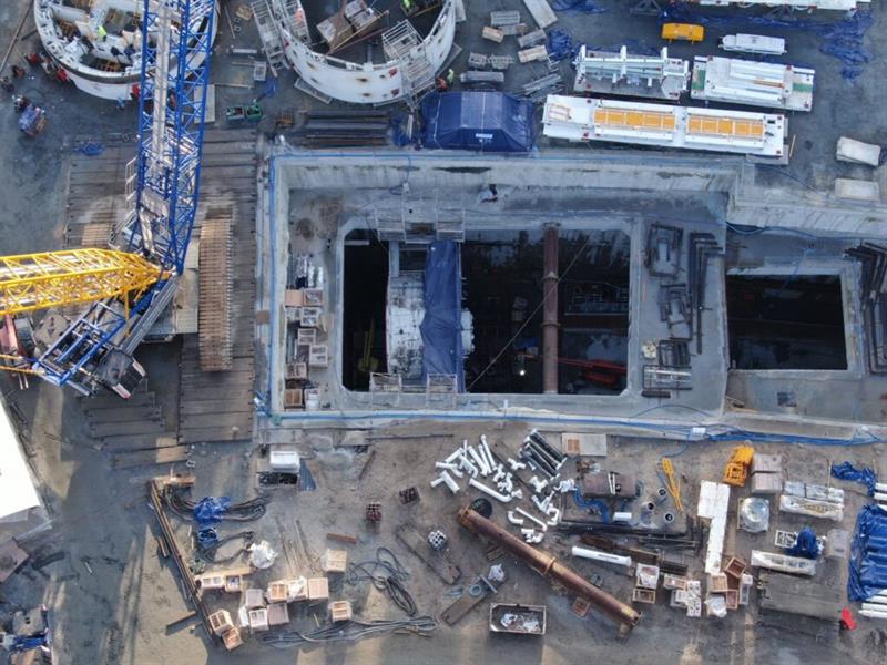 Montaż komponentów maszyny TBM odbywał się zarówno na powierzchni, tuż przy komorze startowej, jak i w jej wnętrzu. Jednocześnie prowadzone były prace przygotowujące samą komorę.