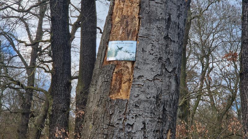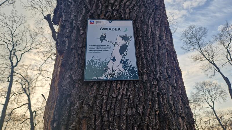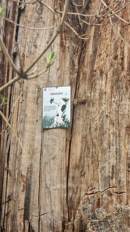 Na tabliczkach, które pojawiły się na martwych - stojących i obalonych drzewach - umieszczone są rysunki przedstawiające sowę siedzącą na drzewie, dzięcioła, nietoperza i motyla oraz napisy: „Świadek. To drzewo pozostawiono, aby wspierać bioróżnorodność, zapewnia schronienie