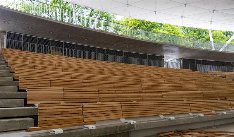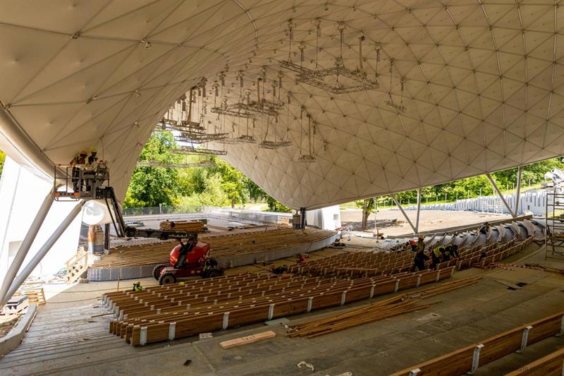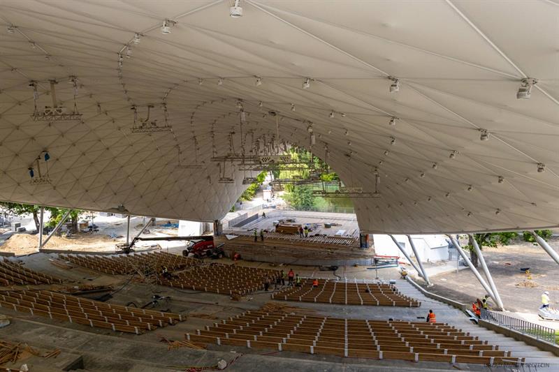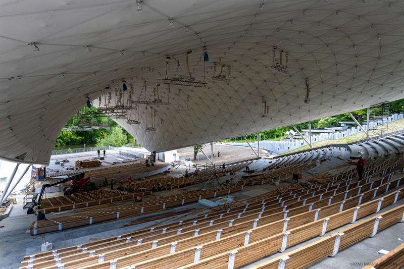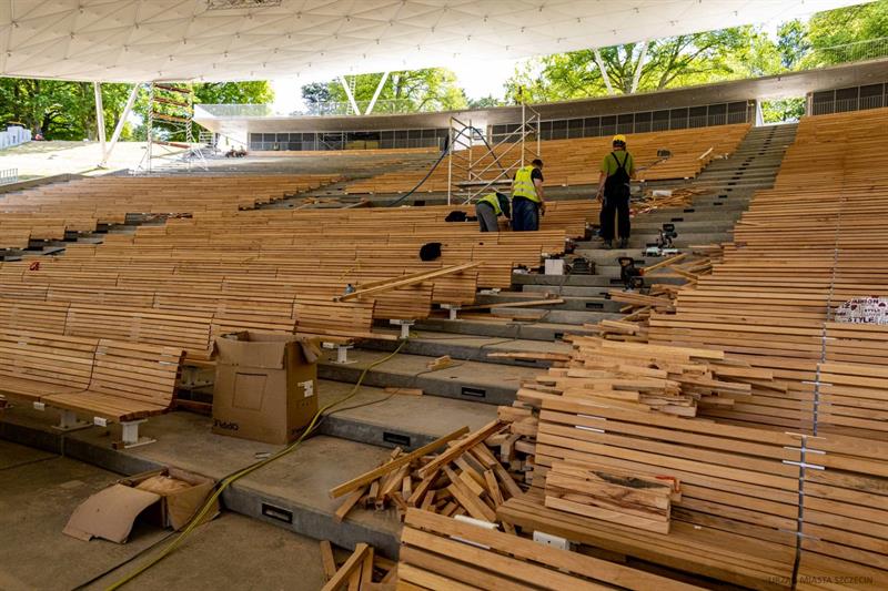 Kończy się montaż nowych siedzisk na widowni. Są prowadzone ostatnie prace na elewacji. Zmienia się również zagospodarowanie terenu: trwa renowacja kaskad i nasadzenia zieleni. Widać, że przebudowa Teatru Letniego dobiega końca.