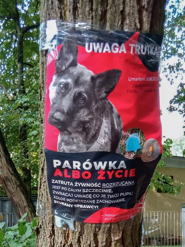 „Zatruta żywność jest rozrzucana po całym Szczecinie. Zwracaj uwagę, co je twój pupil. Zgłoś podejrzane zachowanie. Szukamy sprawcy!" - plakaty ostrzegające przed zwyrodnialcem zabijającym zwierzęta pojawiły się w miejskich parkach. W poszukiwanie sprawcy - oprócz funkcjonariuszy Komendy Miejskiej Policji w Szczecinie - włączyli się wolontariusze Psiego Patrolu. Dysponują nagraniem zkamery monitoringu, na którym widać truciciela.