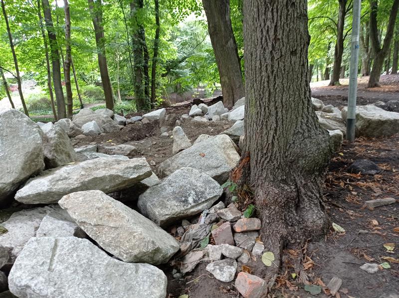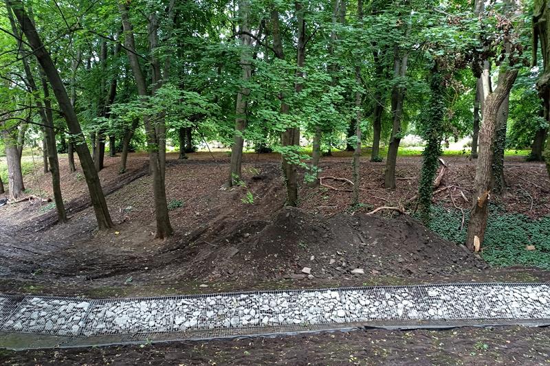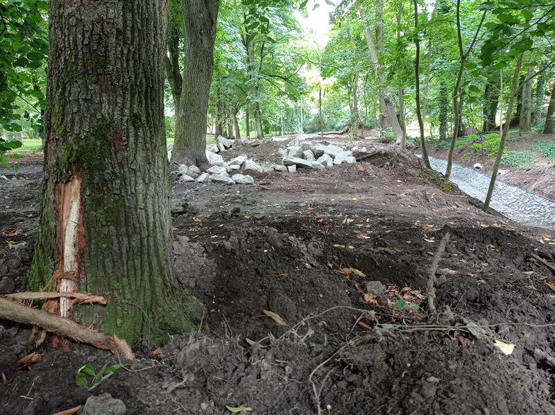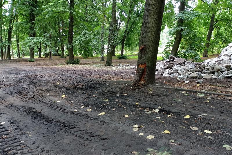 Żadne z drzew wiekowego parku nie jest zabezpieczone nawet poprzez odeskowanie pni. Dlatego na kilku widać świeże rany: płaty kory zerwanej przez pojazdy poruszające się na gąsienicach o szerokim rozstawie w bezpośredniej, a według nowych „zielonych" standardów niedozwolonej bliskości drzew. Ciężki sprzęt w ten sposób ugniata systemy korzeniowe, co może negatywnie wpływać na wegetację podziemnej części drzew.