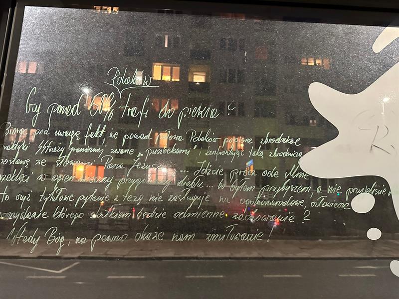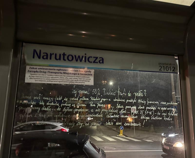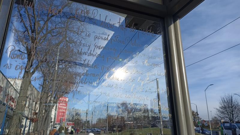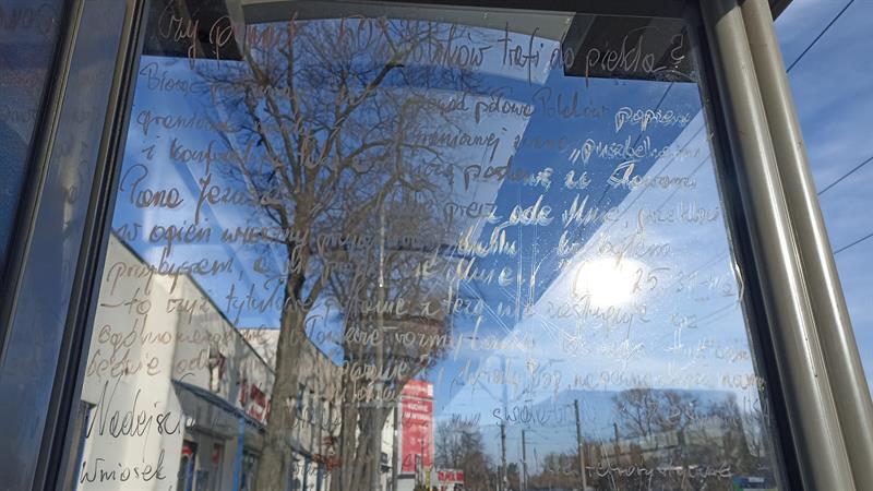- W październiku 2022 roku straż miejska interweniowała przy pl. Zwycięstwa, kiedy to mężczyzna był w trakcie niszczenia wiaty i pisania po szybach czerwonym flamastrem. Jednak problem nadal trwa, a na przystankach pojawiają się różnego rodzaju dziwne manifesty - mówi radna i dokumentuje to zdjęciami. - W ostatnich dniach sytuacja miała miejsce m.in. na przystanku Turzyn czy też przy ul. Narutowicza. Są tam długie rozpiski, co z pewnością wymagało również czasu, aby je tam